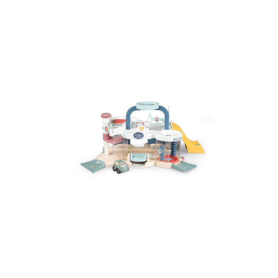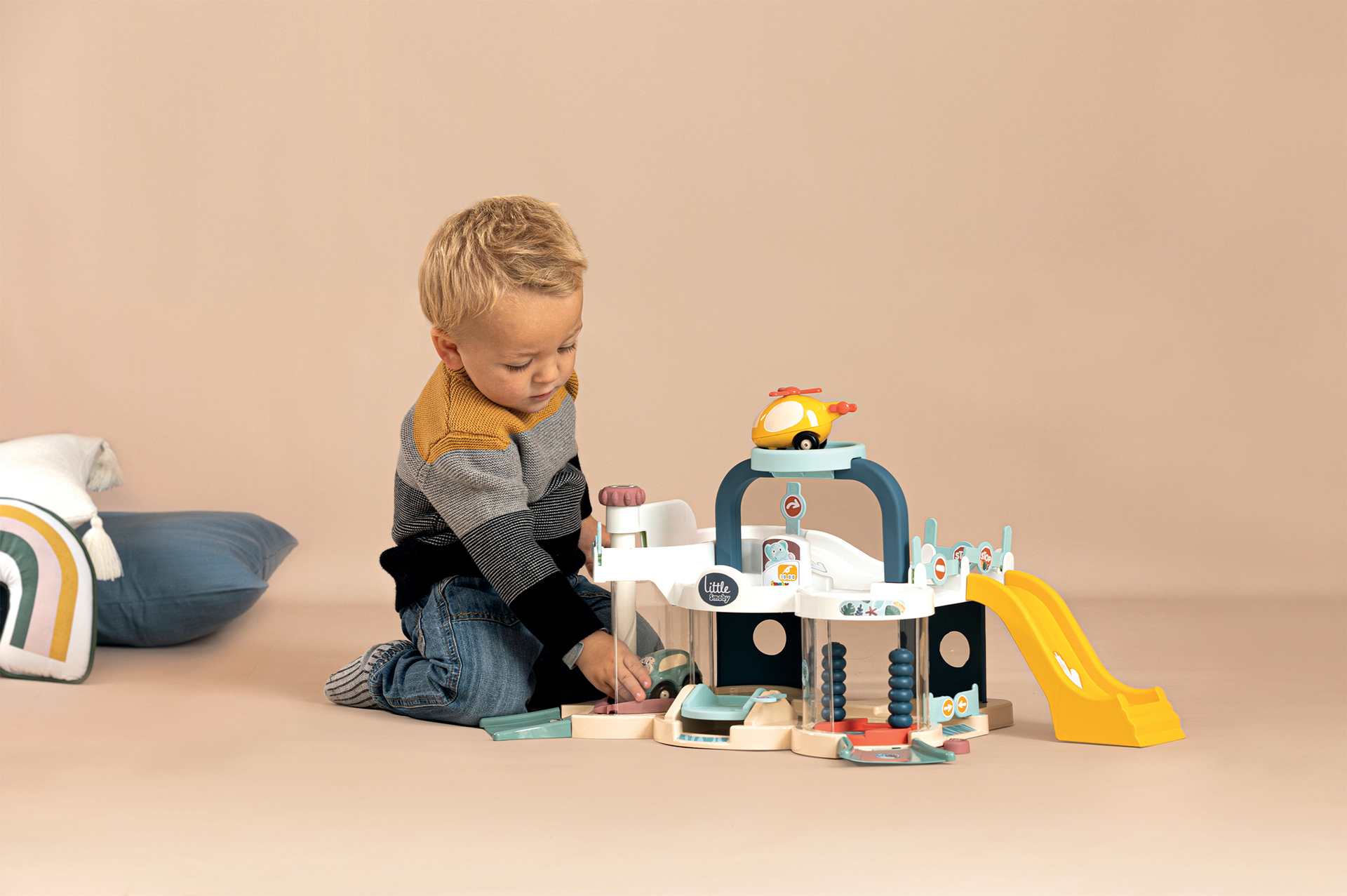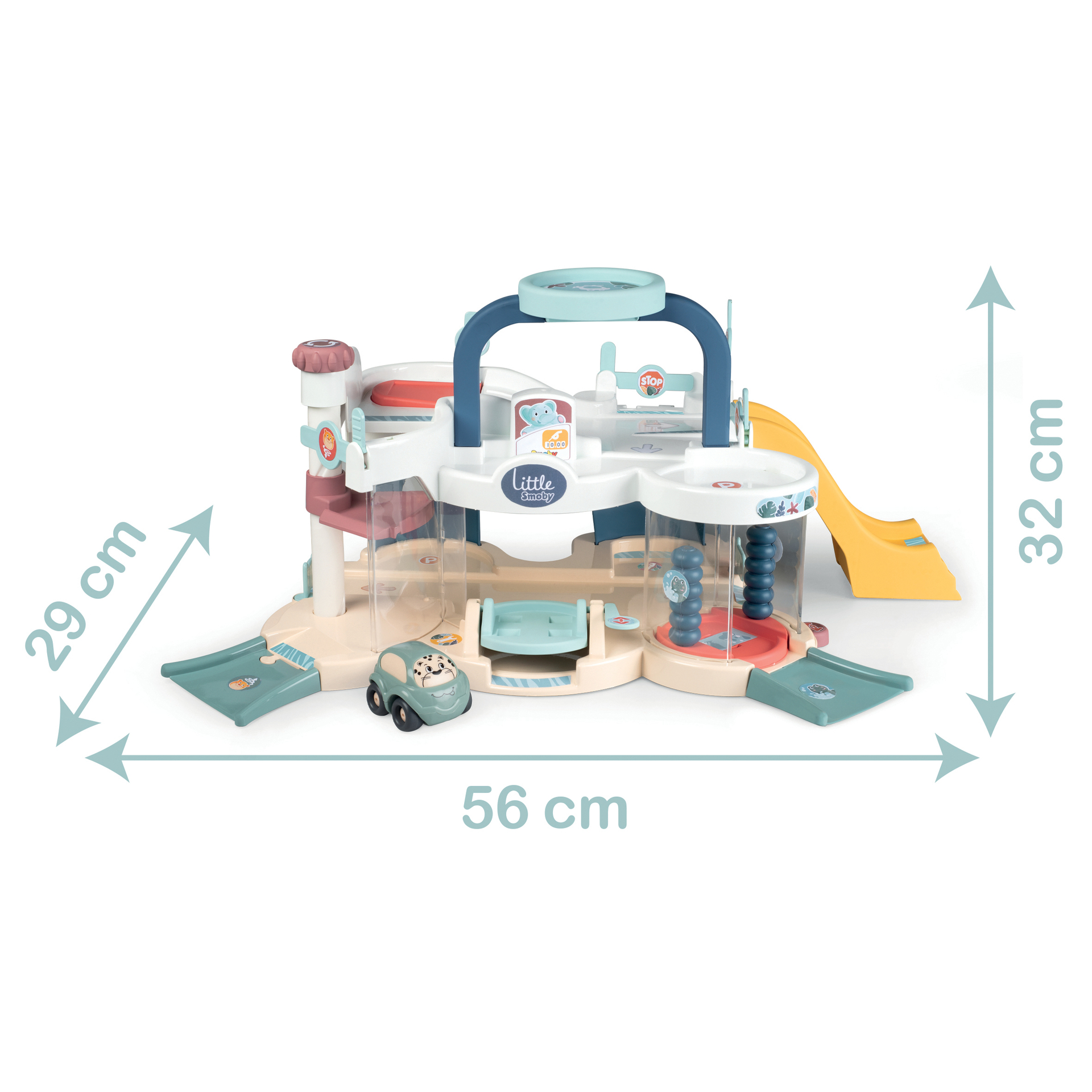 Plus produit Garage 1er âge avec nombreuses activités : ascenseur, station de lavage avec rouleaux, pont de réparation, héliport, rampe, pompe à essence... 1 voiture incluse.