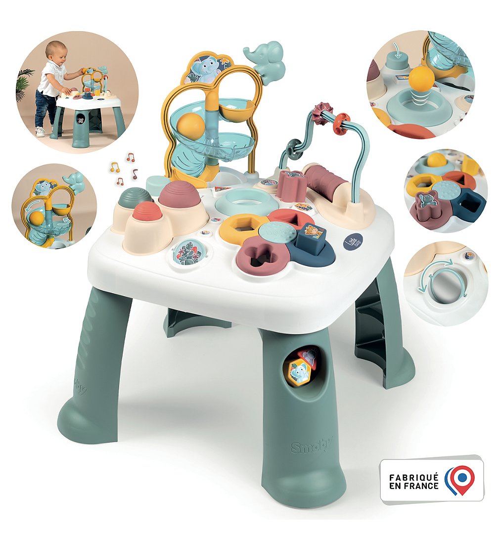 | Plus produit | Table d\'activités pour développer la motricité. Nombreuses fonctions mécaniques : trieur de formes, boulier, pinets, jeu de balles, catapulte, miroir, rouleau. |