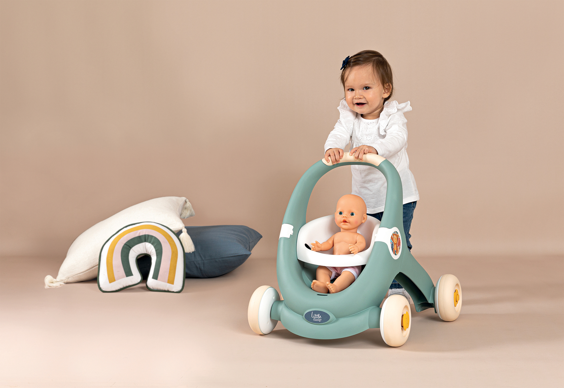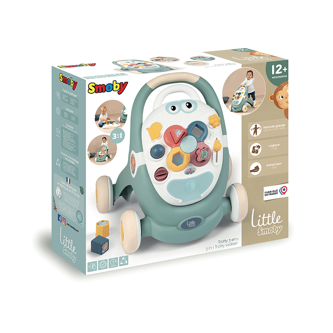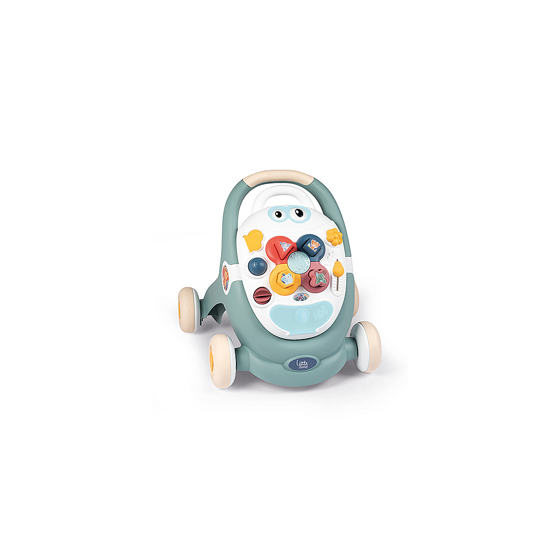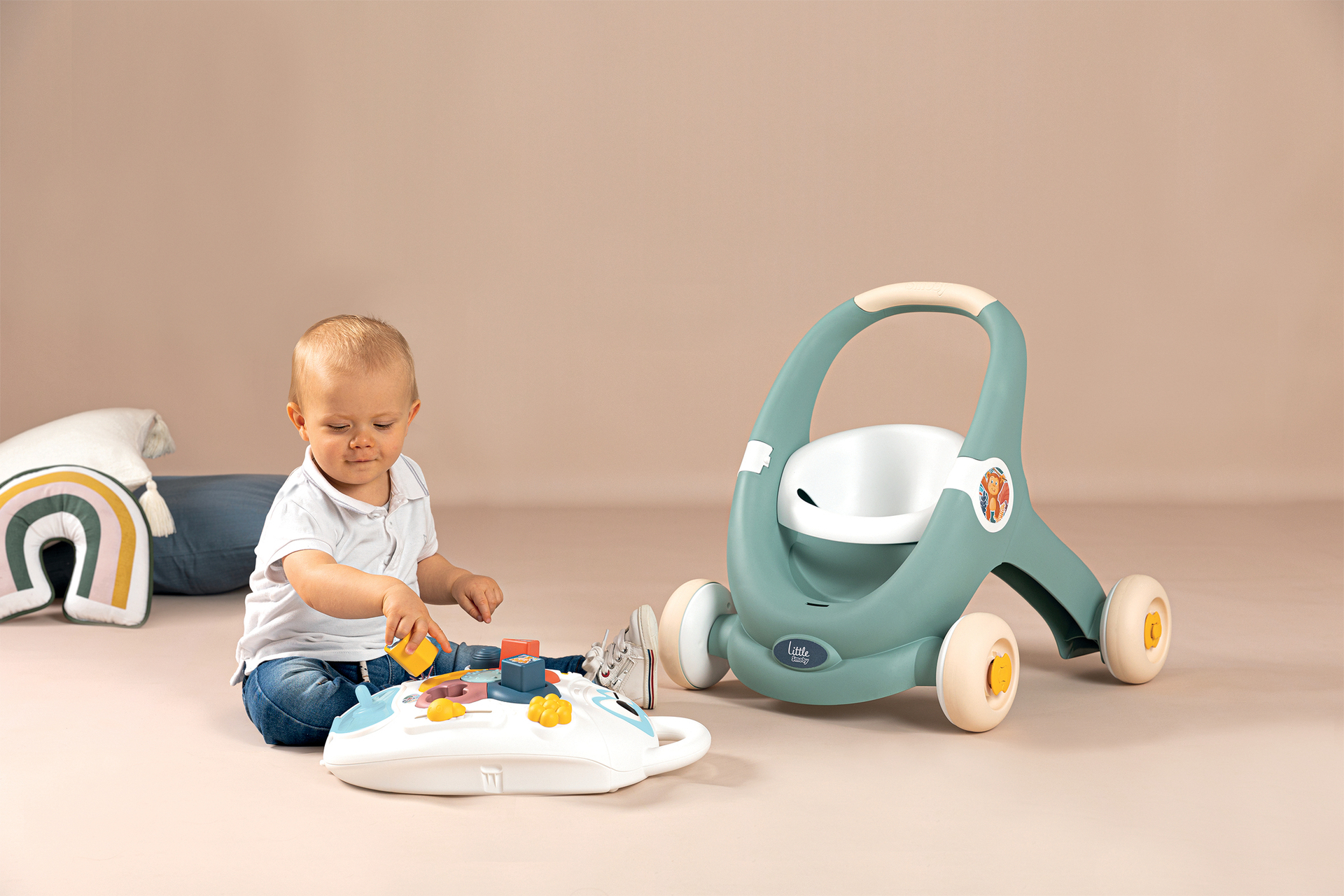 Trotteur Little Smoby 3 en 1 : aide à la marche, tablette d’activités (détachable), et poussette.