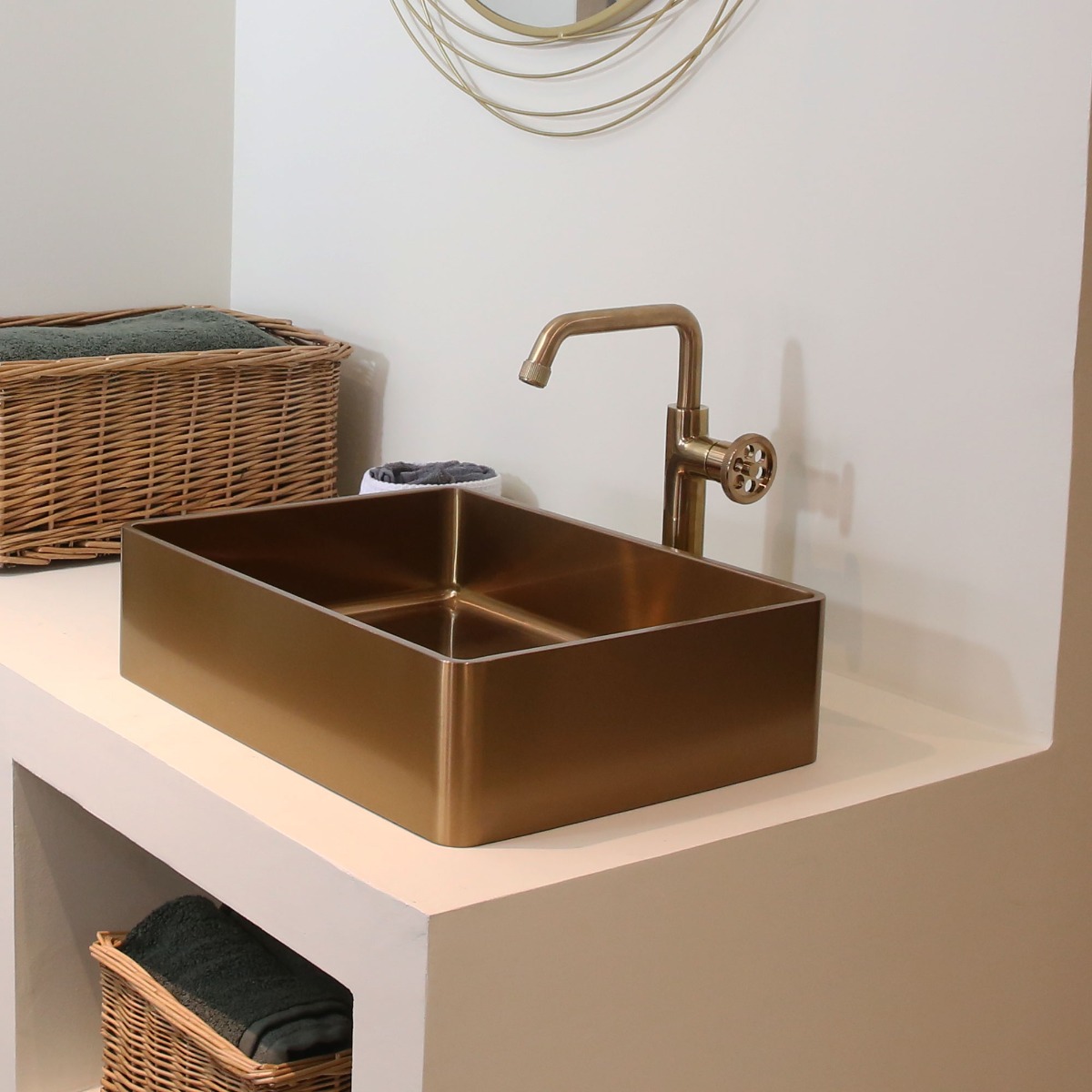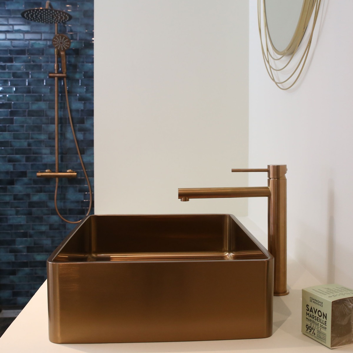 Osez la vasque lavabo inox cuivre brossé avec la collection Luisa ici en version inox. Doté d'un traitement PVD pour une finition encore plus résistante ! La vasque moderne à poser.