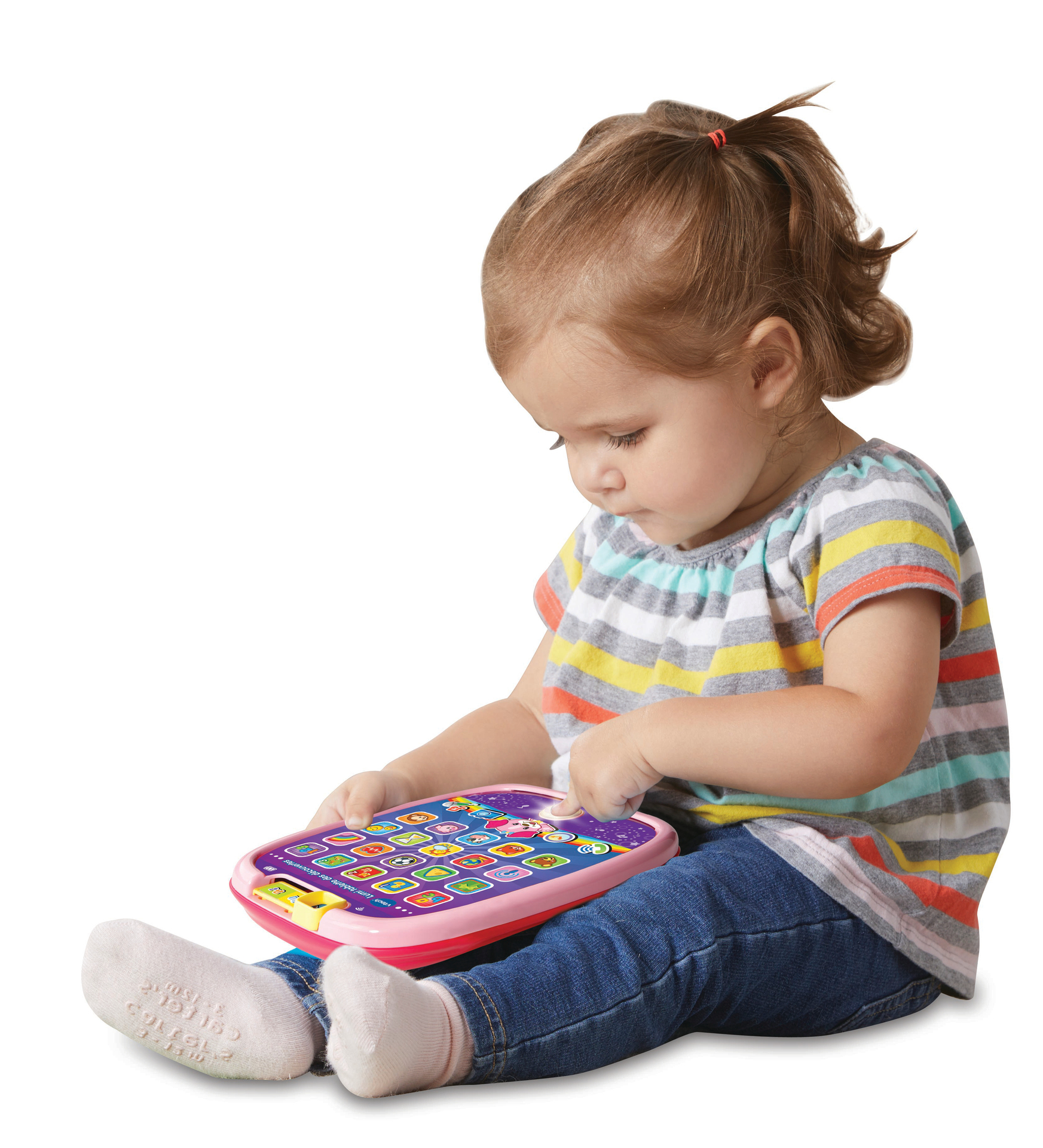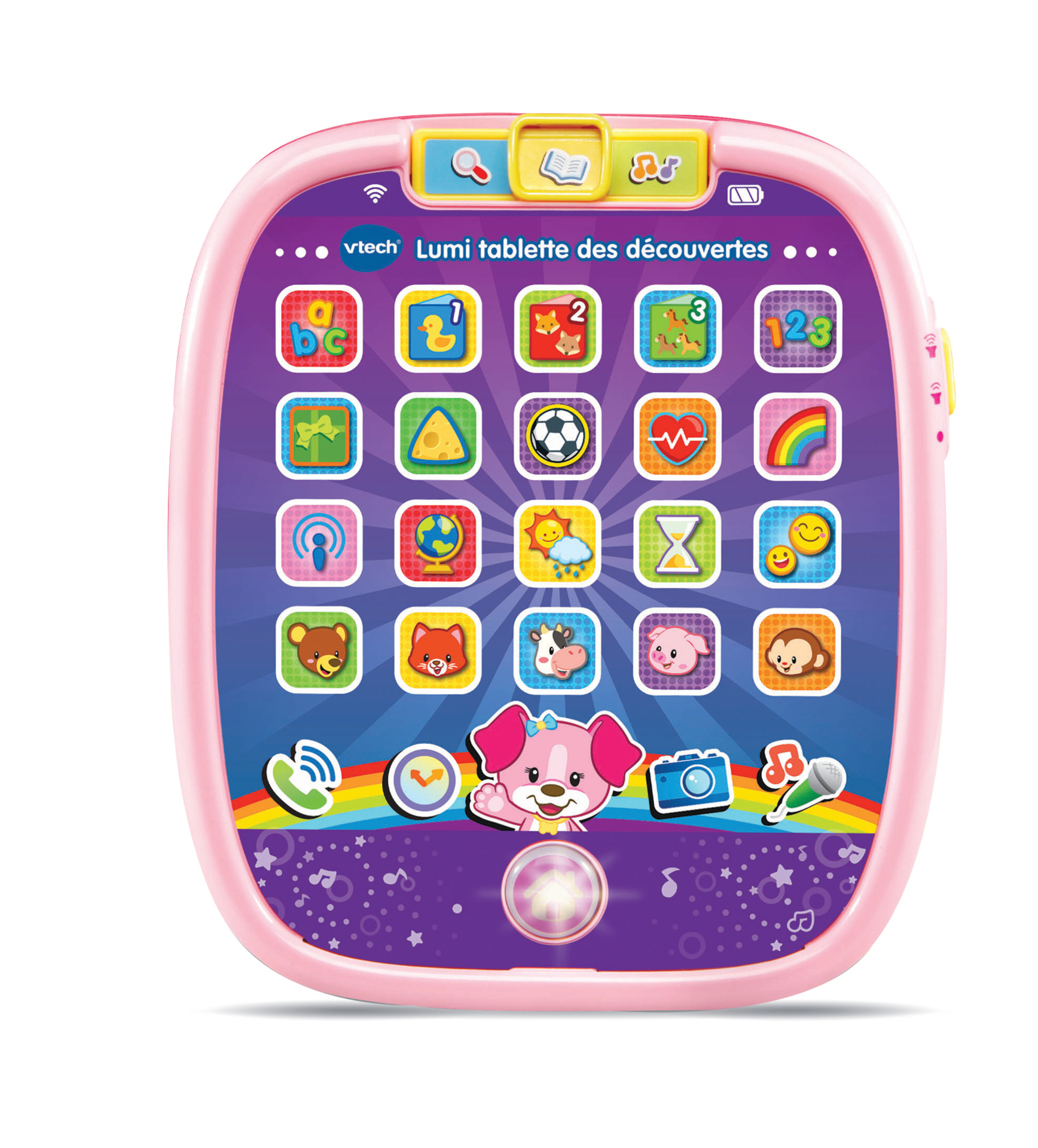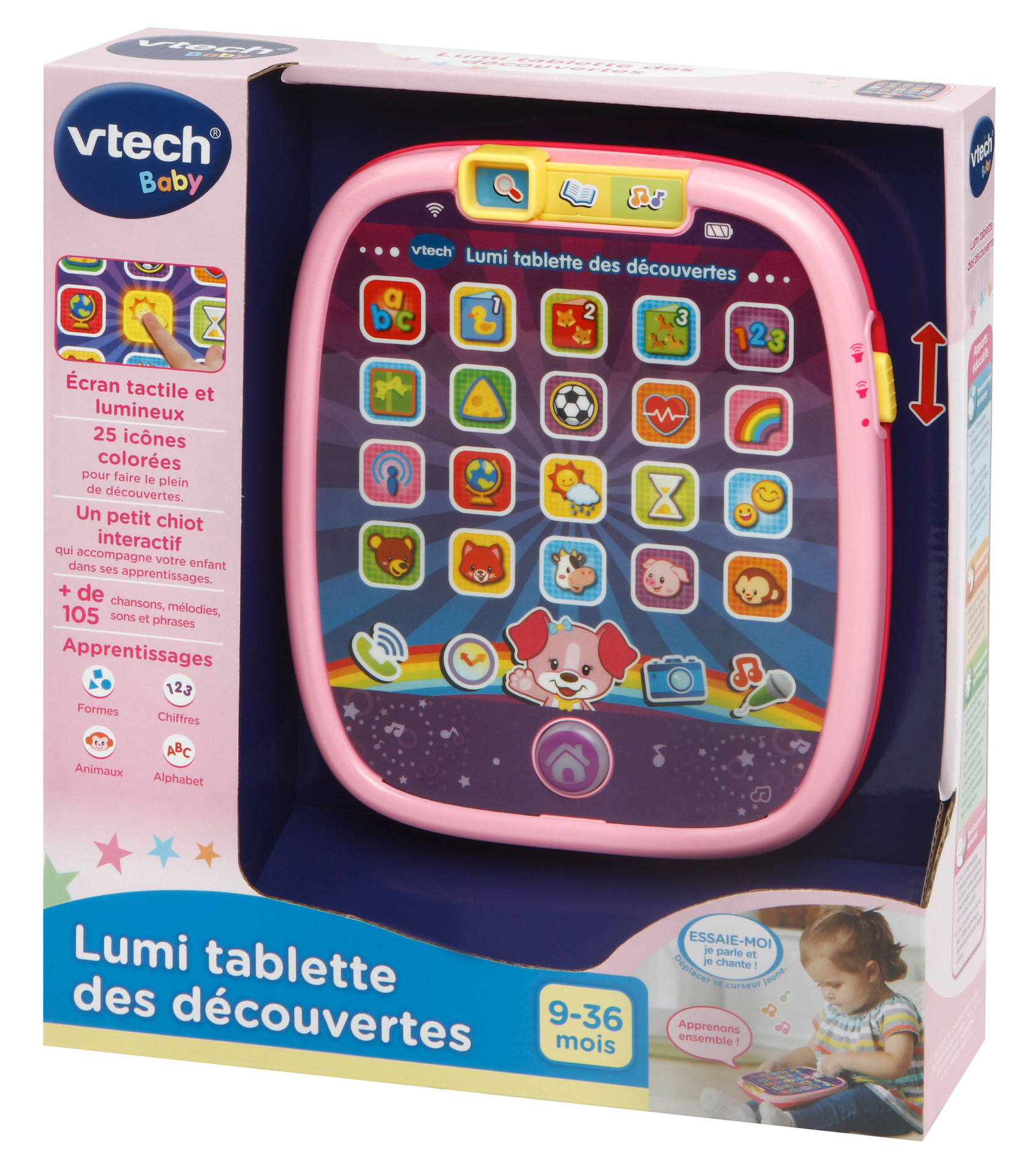 Lumi tablette des découvertes rose - 9 - 36 mois La première tablette de Bébé pour jouer à imiter Papa et Maman. 25 touches tactiles dont 20 lumineuses pour faire le plein de découvertes : les chiffres de 1 à 10, les formes, l'alphabet en chanson, les animaux, découvrir le temps qu'il fait, écouter son ami le chien parler. Le petit chien guide Bébé dans ses découvertes, lui raconte des histoires et l'encourage. Un bouton Maison lumineux pour déclencher des sons rigolos et des phrases amusantes. 3 modes de jeux : Exploration, Découvertes et Musique. 20 mélodies et 3 chansons accompagnent Bébé dans ses découvertes. Réglage du volume sonore et arrêt automatique. Boîte Try-me. Fonctionne avec 3 piles LR03 fournies.