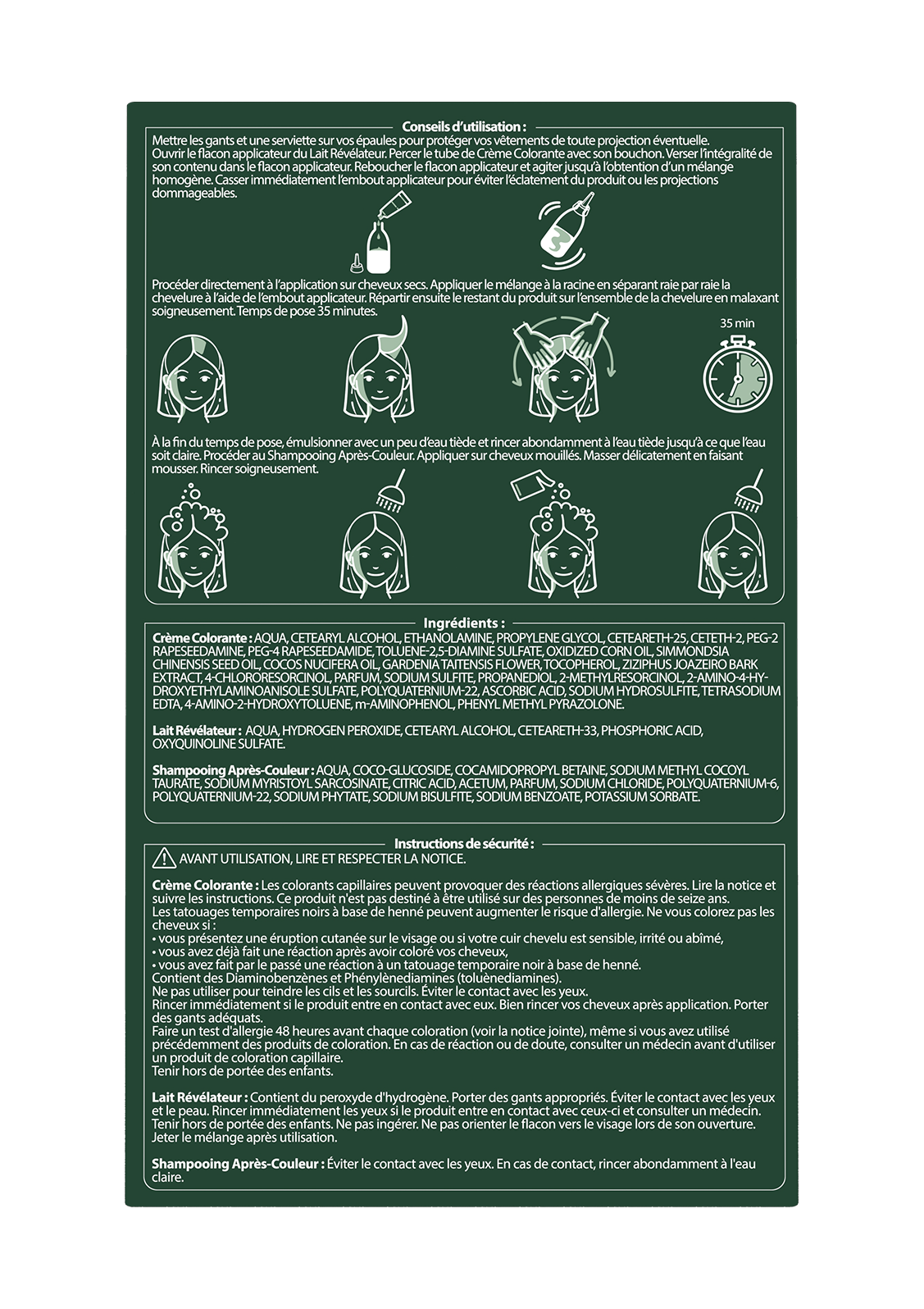 | Avertissements | AVANT UTILISATION, LIRE ET RESPECTER LA NOTICE. Crème Colorante : Les colorants capillaires peuvent provoquer des réactions allergiques sévères. Lire la notice et suivre les instructions. Ce produit n'est pas destiné à être utilisé sur des personnes de moins de seize ans. Les tatouages temporaires noirs à base de henné peuvent augmenter le risque d'allergie. Ne vous colorez pas les cheveux si : • vous présentez une éruption cutanée sur le visage ou si votre cuir chevelu est sensible, irrité ou abîmé, • vous avez déjà fait une réaction après avoir coloré vos cheveux, • vous avez fait par le passé une réaction à un tatouage temporaire noir à base de henné. Contient des Diaminobenzènes et Phénylènediamines (toluènediamines). Ne pas utiliser pour teindre les cils et les sourcils. Éviter le contact avec les yeux. Rincer immédiatement si le produit entre en contact avec eux. Bien rincer vos cheveux après application. Porter des gants adéquats. Faire un test d'allergie 48 heures avant chaque coloration (voir la notice jointe), même si vous avez utilisé précédemment des produits de coloration. En cas de réaction ou de doute, consulter un médecin avant d'utiliser un produit de coloration capillaire. Tenir hors de portée des enfants. Lait Révélateur : Contient du peroxyde d'hydrogène. Porter des gants appropriés. Éviter le contact avec les yeux et le peau. Rincer immédiatement les yeux si le produit entre en contact avec ceux-ci et consulter un médecin. Tenir hors de portée des enfants. Ne pas ingérer. Ne pas orienter le flacon vers le visage lors de son ouverture. Jeter le mélange après utilisation. Shampooing Après-Couleur : Éviter le contact avec les yeux. En cas de contact, rincer abondamment à l'eau claire. |