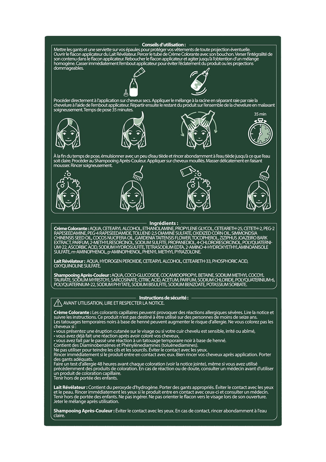 | Avertissements | AVANT UTILISATION, LIRE ET RESPECTER LA NOTICE. Crème Colorante : Les colorants capillaires peuvent provoquer des réactions allergiques sévères. Lire la notice et suivre les instructions. Ce produit n'est pas destiné à être utilisé sur des personnes de moins de seize ans. Les tatouages temporaires noirs à base de henné peuvent augmenter le risque d'allergie. Ne vous colorez pas les cheveux si : • vous présentez une éruption cutanée sur le visage ou si votre cuir chevelu est sensible, irrité ou abîmé, • vous avez déjà fait une réaction après avoir coloré vos cheveux, • vous avez fait par le passé une réaction à un tatouage temporaire noir à base de henné. Contient des Diaminobenzènes et Phénylènediamines (toluènediamines). Ne pas utiliser pour teindre les cils et les sourcils. Éviter le contact avec les yeux. Rincer immédiatement si le produit entre en contact avec eux. Bien rincer vos cheveux après application. Porter des gants adéquats. Faire un test d'allergie 48 heures avant chaque coloration (voir la notice jointe), même si vous avez utilisé précédemment des produits de coloration. En cas de réaction ou de doute, consulter un médecin avant d'utiliser un produit de coloration capillaire. Tenir hors de portée des enfants. Lait Révélateur : Contient du peroxyde d'hydrogène. Porter des gants appropriés. Éviter le contact avec les yeux et le peau. Rincer immédiatement les yeux si le produit entre en contact avec ceux-ci et consulter un médecin. Tenir hors de portée des enfants. Ne pas ingérer. Ne pas orienter le flacon vers le visage lors de son ouverture. Jeter le mélange après utilisation. Shampooing Après-Couleur : Éviter le contact avec les yeux. En cas de contact, rincer abondamment à l'eau claire. |