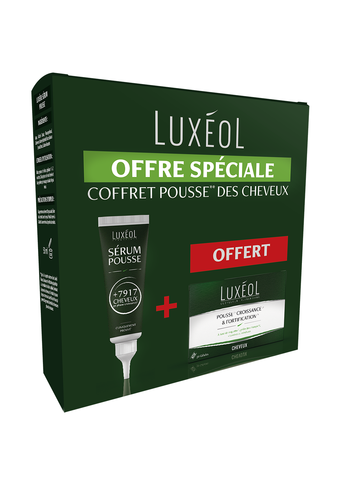 Luxéol pousse, croissance et fortification 1 mois : Ingrédients : extrait de parties aériennes de roquette (eruca sativa), maltodextrine, agent d'enrobage d'origine végétale : hydroxypropylméthylcellulose, poudre de parties aériennes de prêle des champs (equisetum arvense), sulfate de zinc, antiagglomérant : sels de magnésium d'acides gras, sulfate de cuivre, chlorhydrate de pyridoxine (vitamine b6), sélénite de sodium, d-biotine (vitamine b8). Luxéol sérum pousse : Ingrédients : aqua, alcohol denat, phenoxyethanol, carbomer, sodium hydroxide, pisum sativum sprout extract, sodium benzoate.