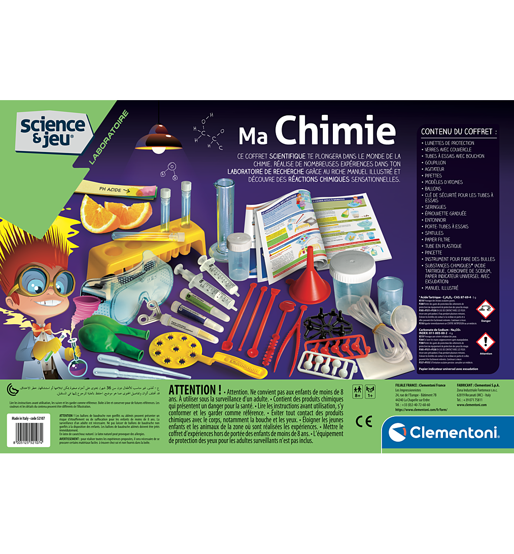 • Un coffret complet pour réaliser plus de 170 expériences de chimie sans danger avec des produits courants. • Grâce au livret d'instructions complet, les enfants seront guidés dans les expériences et pourront épater leurs amis. • Toutes les activités proposées respectent les dernières normes de sécurité européennes.