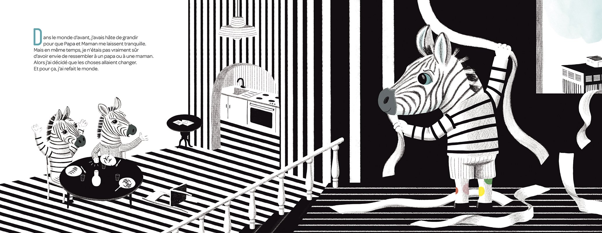 Dans un monde rayé en noir en blanc et rempli d'interdits, un zébron décide de refaire le monde. Des couleurs apparaissent sur son pelage. Avec sa cousine, il va semer la couleur et la vie.