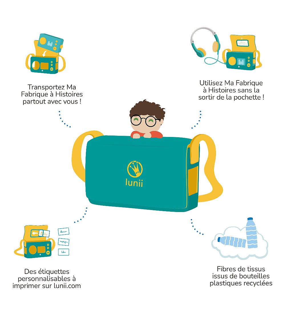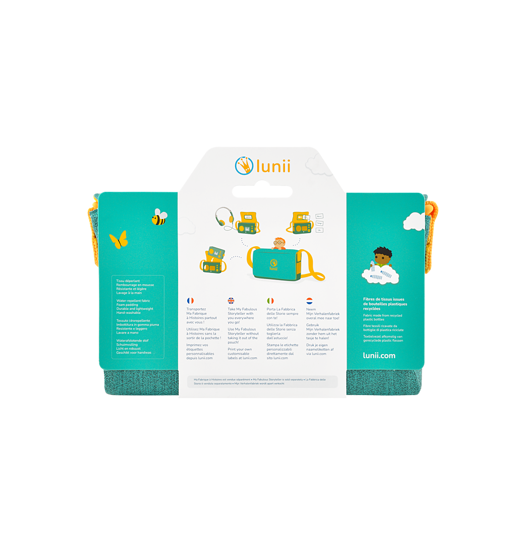 À la fois résistante et légère, Ma Pochette Lunii accompagne l’enfant dans ses aventures quotidiennes tout en prenant soin de Ma Fabrique à Histoires.
