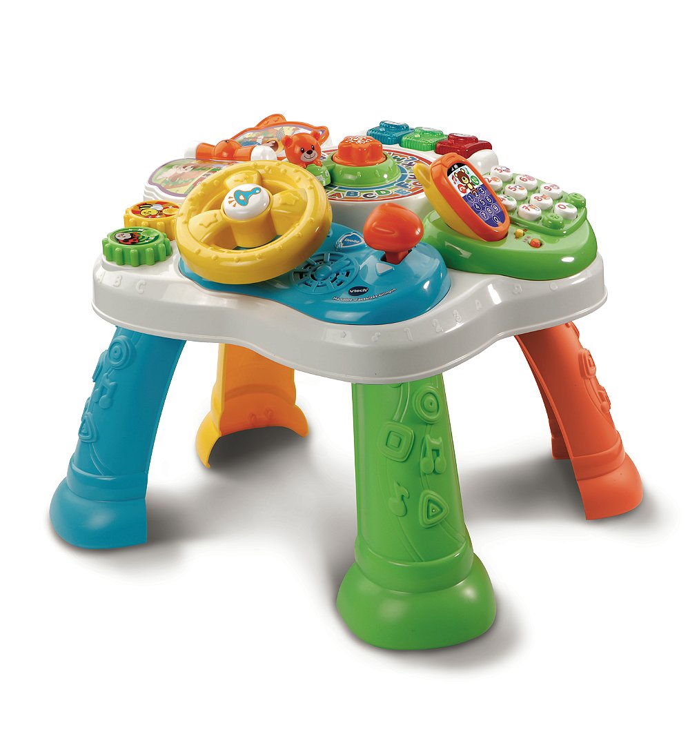 Ma table d'activités bilingue - 9 - 36 mois 2 en 1 : tableau d'éveil pour jouer au sol et table d'activités ! 100% bilingue : français et anglais. Un volant avec un bouton Klaxon pour faire tourner l'ourson et découvrir l'alphabet en musique. Un levier de vitesses, un livret avec deux doubles-pages à manipuler pour découvrir 4 chansons illustrées. Trois grosses touches de piano lumineuses pour initier Bébé à la musique, découvrir les couleurs et les formes. Un téléphone amovible et son clavier pour découvrir les chiffres, le nom des animaux et leur cri. Un bouton étoile au centre de la table pour déclencher dix mélodies, une chanson et des sons rigolos. Des engrenages pour développer la motricité de Bébé. 4 pieds détachables pour le jeu au sol. 6 chansons et 20 mélodies. Réglage du volume sonore et arrêt automatique. Boîte Try-me. Fonctionne avec 2 piles LR6 fournies.