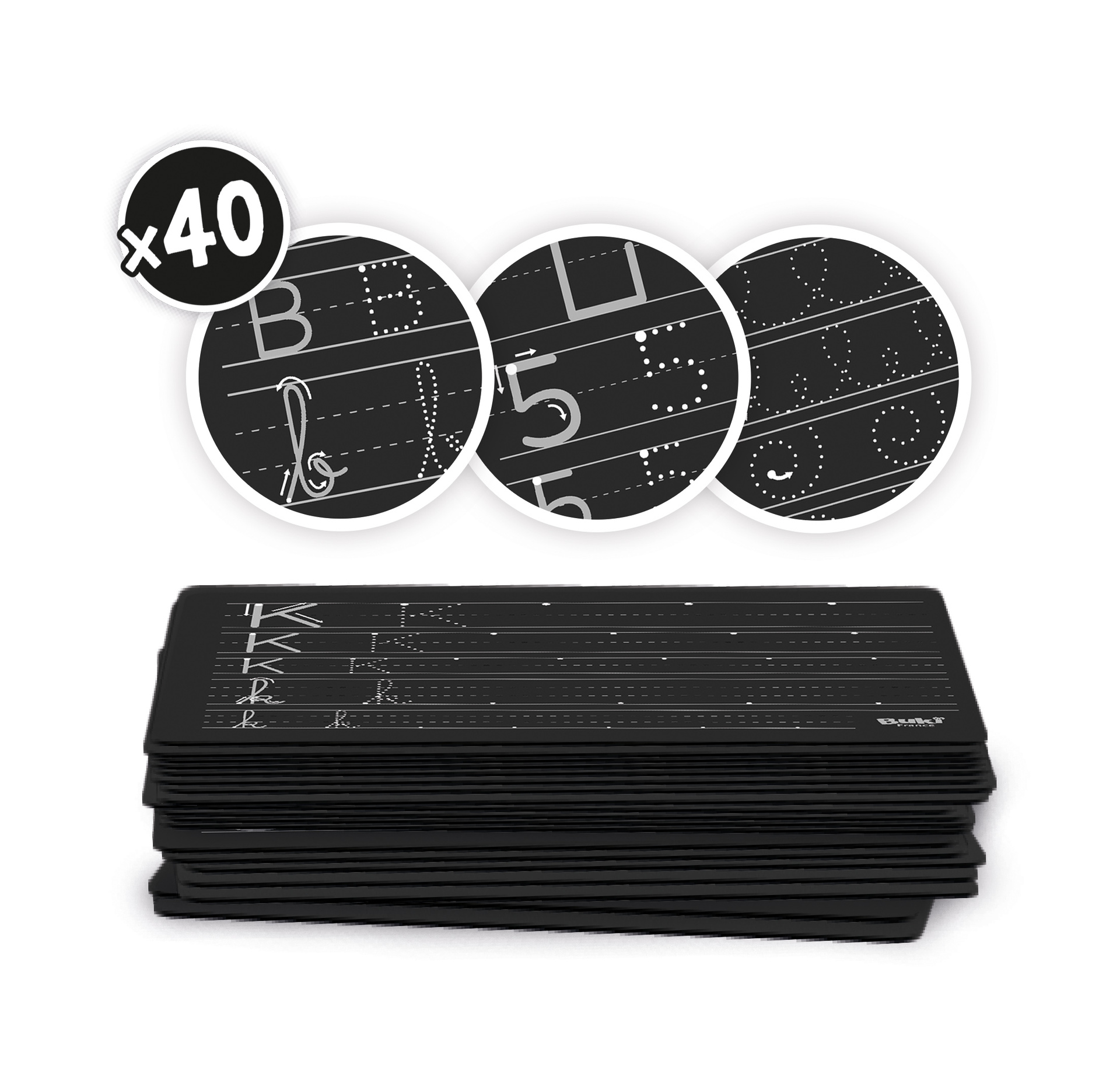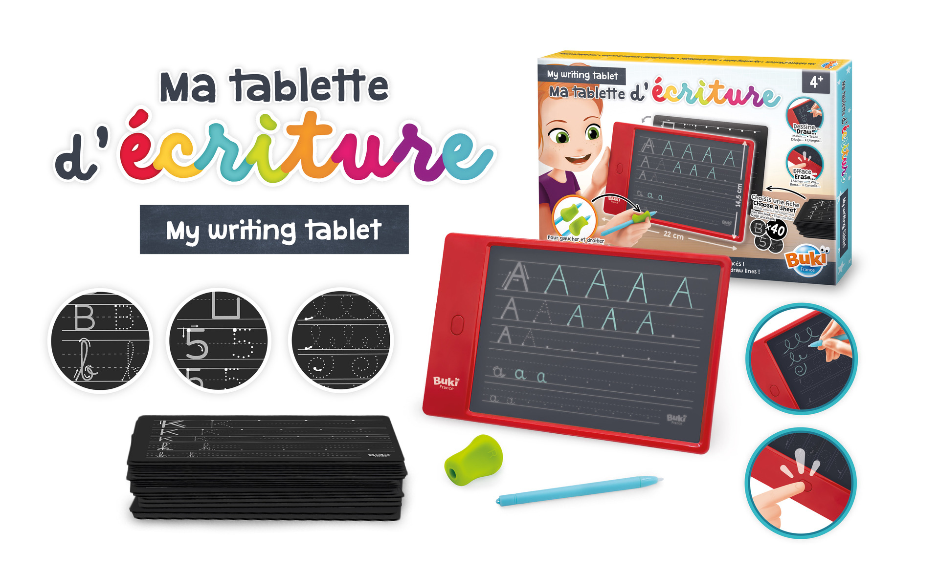 Une tablette avec écran LCD pour apprendre à écrire les lettres de l’alphabet en majuscule, en minuscules cursive, les chiffres de 0 à 9 mais également apprendre à tracer les lignes, courbes et droites ! L’enfant place une fiche sous la tablette et suit les tracés de chaque fiche pour s’entraîner. Pour effacer, il suffit d’appuyer sur le bouton ! Pour écrire, il suffit d’utiliser le stylet comme un stylo. L’enfant peut ajouter le guide qui lui apprendra à bien placer ses doigts sur le stylo. Le guide peut être également utilisé sur un stylo de la maison ! La tablette peut également être utilisée pour dessiner et même pour reproduire des dessins grâce à sa transparence. La tablette ne pèse que 100 g et se transporte facilement. Dimensions : 22 x 14,5 cm. 20 cartes pour un total de 40 fiches : - 26 lettres de l’alphabet - Chiffres de 0 à 9 - 4 fiches sur les tracés Nécessite une pile CR2025 incluse. Dès 4 ans.
