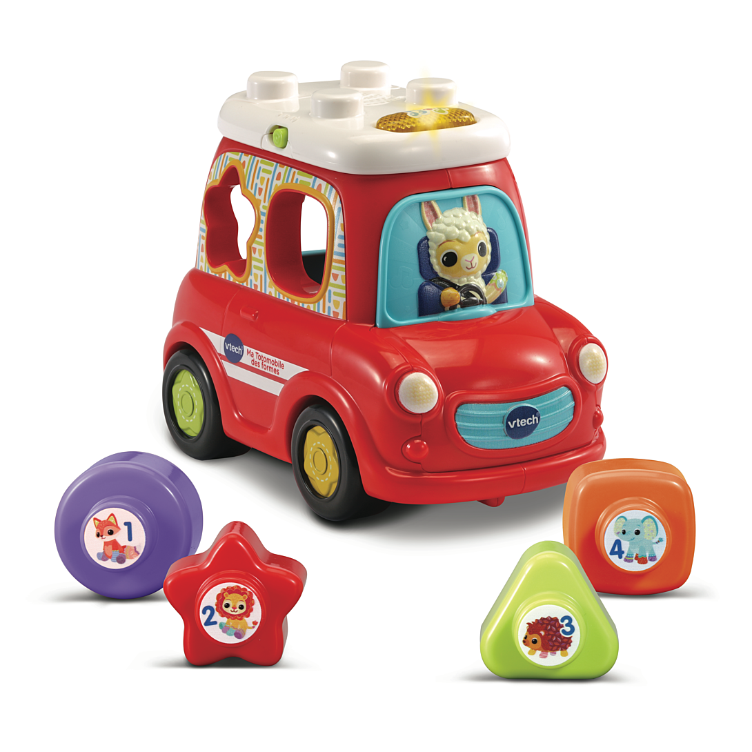 Ma Totomobile des formes - 12 - 36 mois Bébé fait avancer sa voiture et déclenche sons, mélodies et effets lumineux Grâce au classeur de formes, bébé développe sa motricité fine et découvre les chiffres, les objets, les animaux et les formes. Les formes s’encastrent aussi sur le toit pour personnaliser sa voiture ! Pratique, les blocs se rangent dans le coffre de la voiture pour ne pas les perdre. Plus de 50 chansons, mélodies, sons et phrases Arrêt automatique. Réglage du volume sonore. Boîte Try-me. Fonctionne avec 2 piles LR03/AAA incluses
