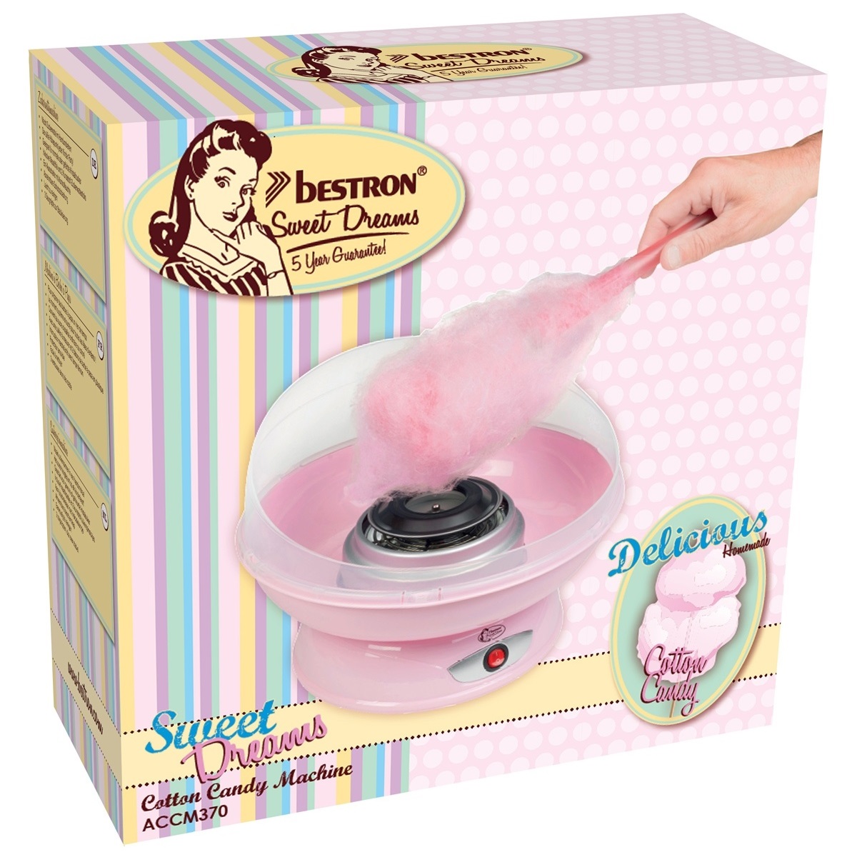 ACCM370 - machine à barbe à papa - Machine à Barbe à Papa Bestron ACCM370 pour préparer des barbes à papa un rien de temps. Le moment suprême et sucré pour toutes les fêtes d'enfants ! Convient au sucre cristallisé ordinaire ou coloré. Avec une cuillère à mesurer et 2 bâtons de barbe à papa en plastique. - Type de produit : Machine à Barbe à Papa.