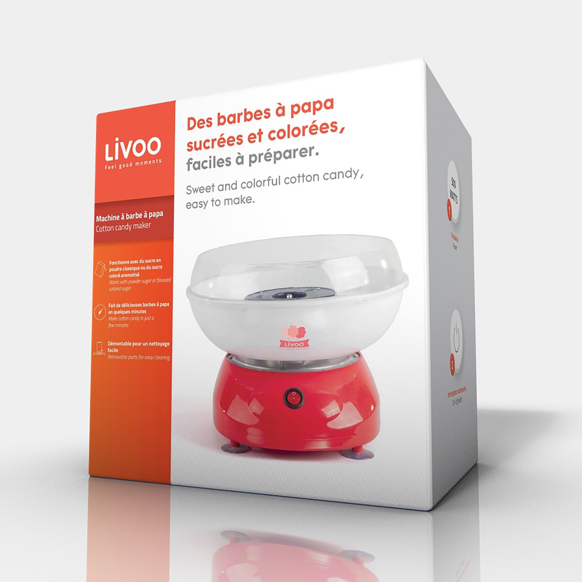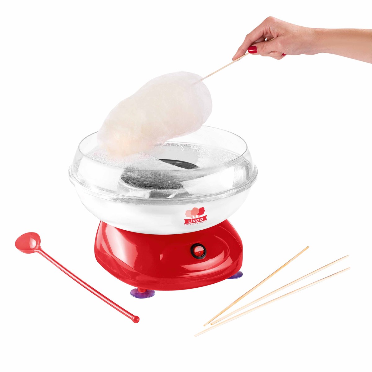 dop136 - machine à barbe à papa - Machine à barbe à papa bicolore Domoclip DOP136, cuve amovible en plastique, 6 sticks en bambou, cuillère doseuse pour le sucre, interrupteur marche/arrêt, fonctionne avec du sucre en poudre classique ou du sucre coloré aromatisé, démontable pour un nettoyage facile, pieds anti dérapant. - Poids brut : 1.76 kg.