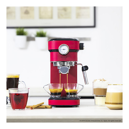 Cecotec Machine à café expresse Cafelizzia 790 Shiny Pro pour préparer du café expresso et des cappuccinos. Elle possède un système de préchauffage rapide par thermoblock, 20 bars, manomètre PressurePro, Mode Auto pour 1 ou 2 café(s), buse vapeur orientable et conduit d’eau pour infusions. Machine à café express avec design élégant et compact pour les amoureux du bon café. Elle permet de réaliser tout type de café avec sa puissance maximale de 1350 W et émet également de l’eau chaude pour les infusions. Son système de préchauffage rapide par thermoblock permet de garantir que la température se maintienne dans un intervalle optimal afin d’obtenir le meilleur café. Sa puissante pompe à pression avec technologie ForceAroma de 20 bars permet d’obtenir la meilleure crème et un arôme maximal à chaque café. Manomètre de contrôle PressurePro pour vérifier la pression en temps réel. Inclus : buse vapeur orientable avec protection qui texturise le lait selon vos préférences et permet d’obtenir la meilleure crème. Émet de l’eau chaude à la température idéale pour les infusions. Bras porte-filtres avec double sortie et deux filtres pour préparer un ou deux café(s) automatiquement. Réservoir d’eau qui s’extrait avec 1,2 litres de capacité. Plateau réchauffe-tasses en acier inoxydable. Convient pour petites tasses à expresso et grandes tasses de petit-déjeuner. Plateau d'égouttage démontable pour faciliter un nettoyage rapide. Système Économie d’énergie avec déconnexion automatique et Standby. Témoins lumineux pour chaque fonction.
