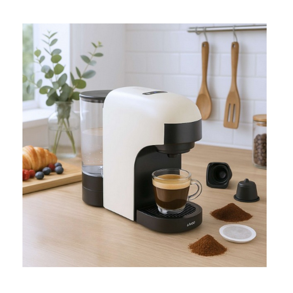 Accessoires inclus : 3 adaptateurs pour capsules et café moulu, cuillère doseuse avec tasseur.