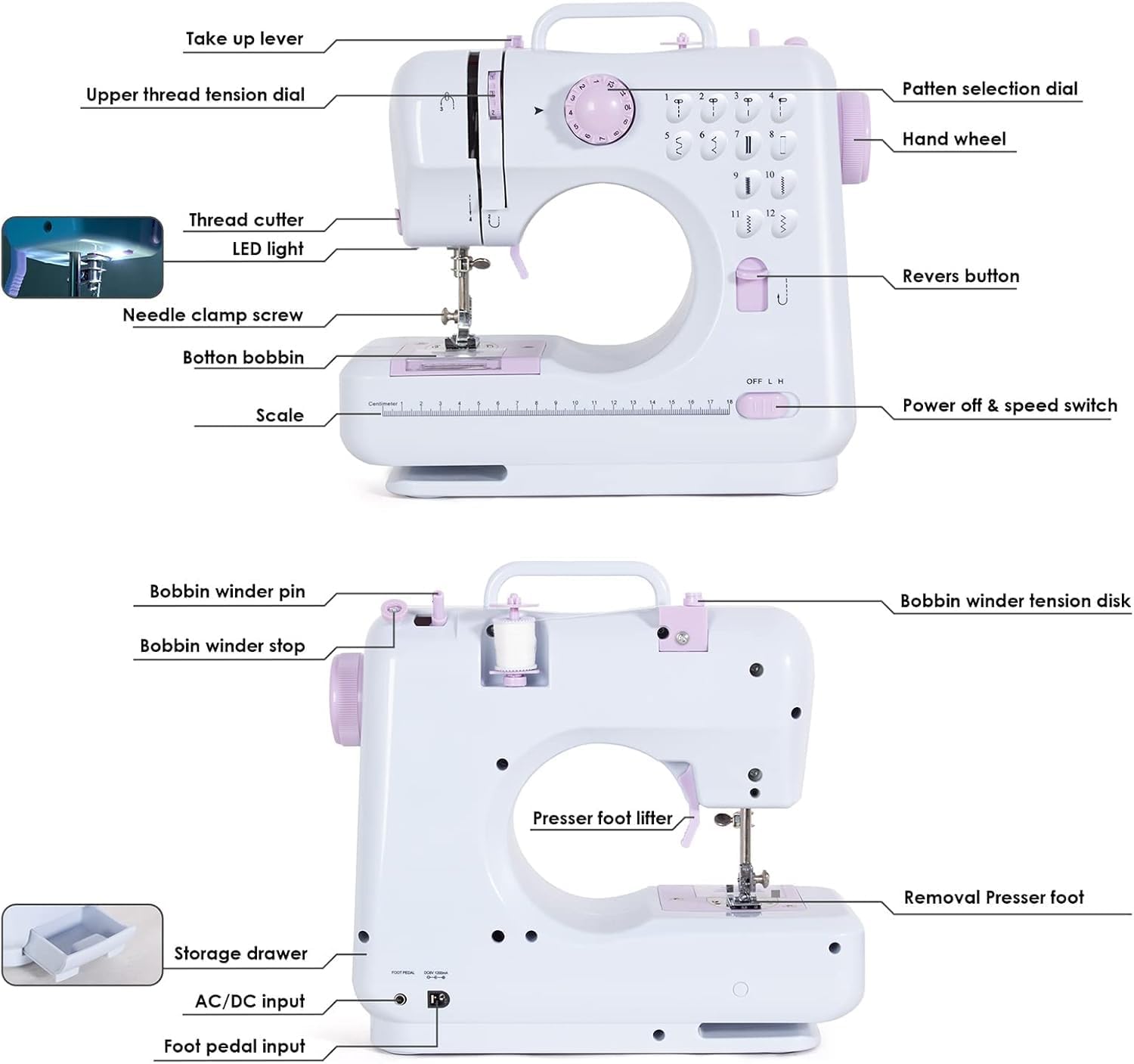 Bonne pour les débutants - Facile à installer et à utiliser, cette machine à coudre possède plusieurs fonctionnalités conviviales comme la fonction d'enroulement automatique de fil, une lumière LED pour l'éclairage et une fonction de couture en arrière. Que vous travailliez avec des tissus résistants ou délicats, notre machine à coudre assure précision et efficacité.