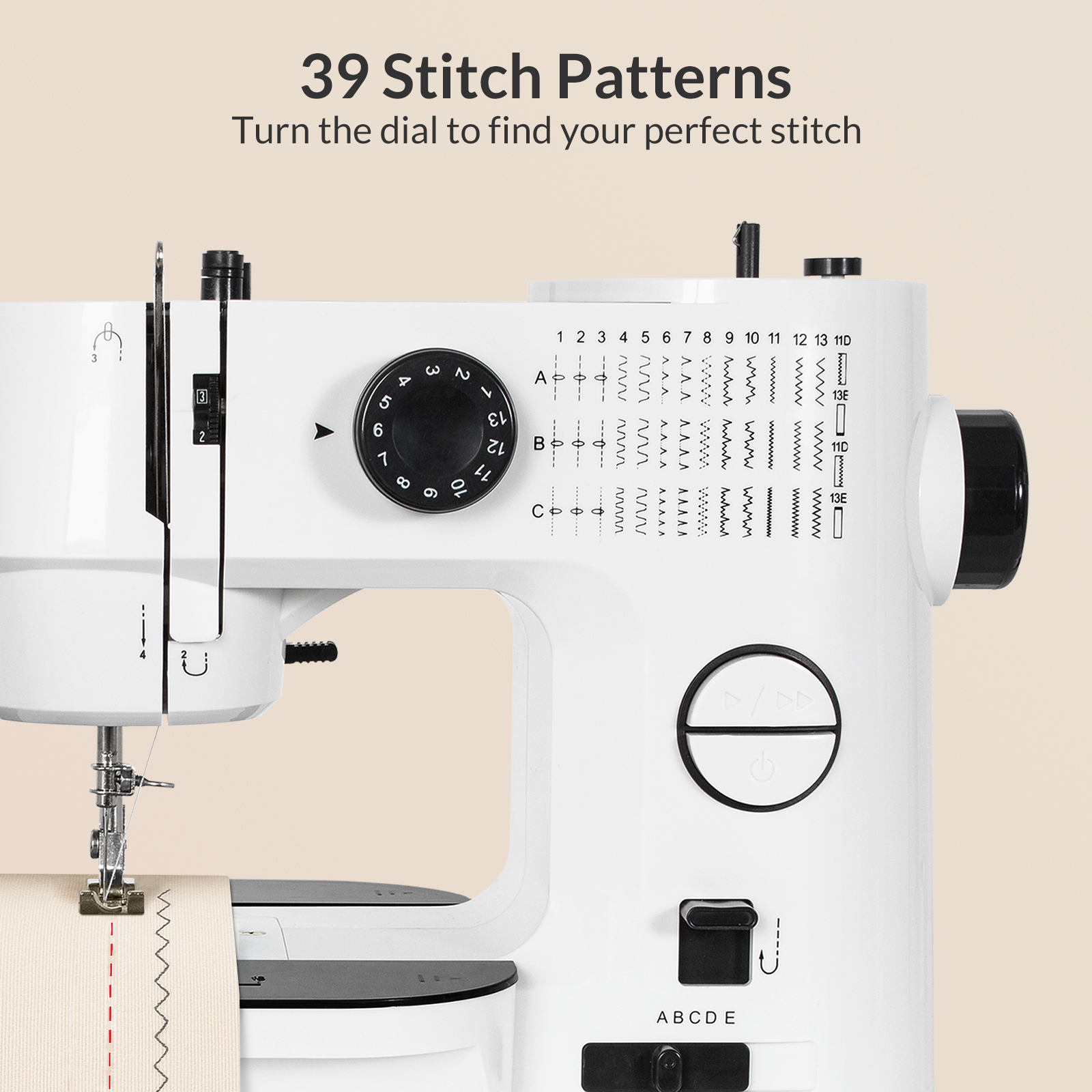 39 points de couture intégrés : Choisissez parmi 39 modes de couture - point droit, zigzag, décoratif et boutonnière. Réglez simplement la molette pour adapter la machine à tous vos besoins, couture, retouche ou création.