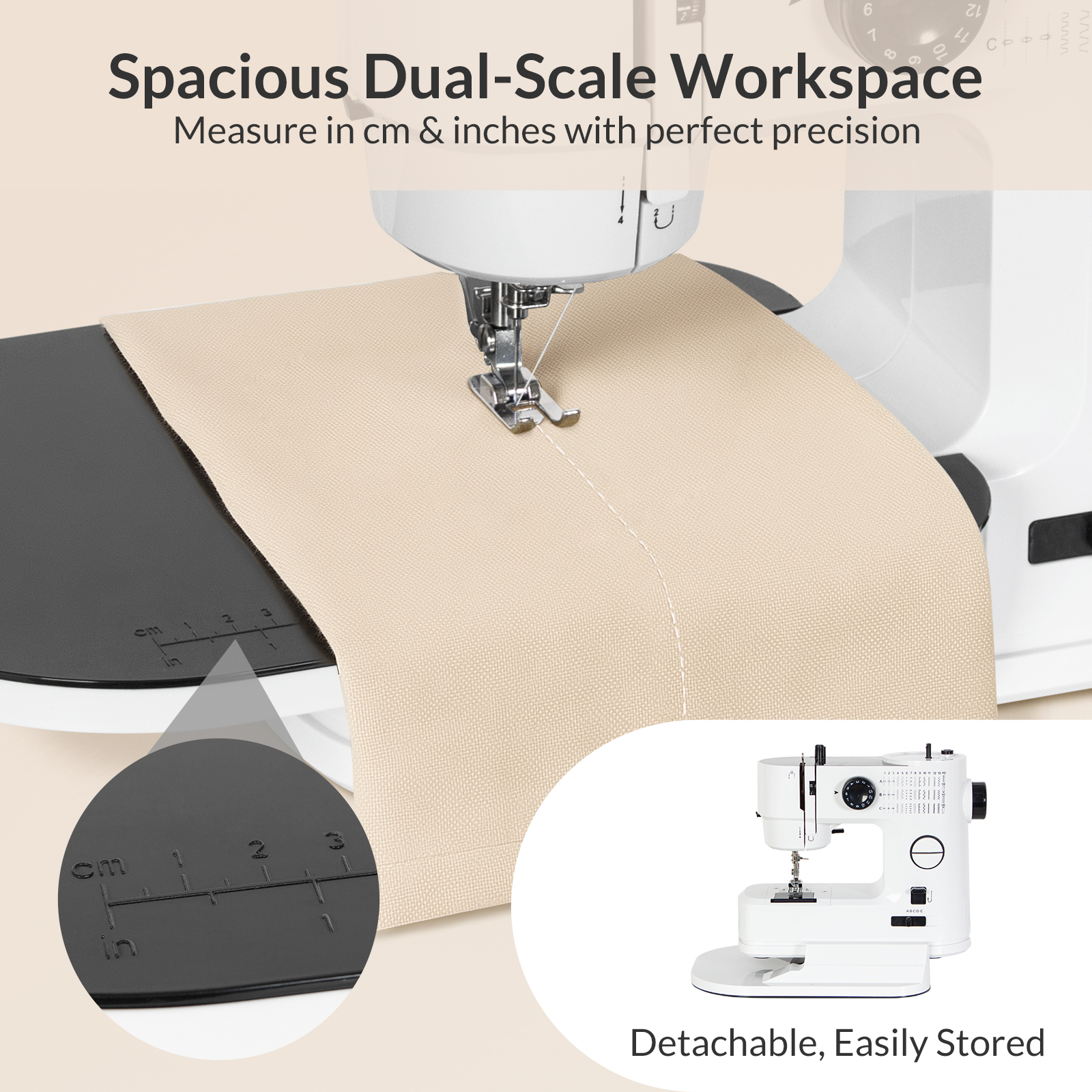 Table d’extension à double échelle : La table détachable offre une surface de travail stable et spacieuse pour les grands tissus. Les échelles graduées en centimètres et en pouces assurent une précision maximale dans vos mesures et vos finitions.