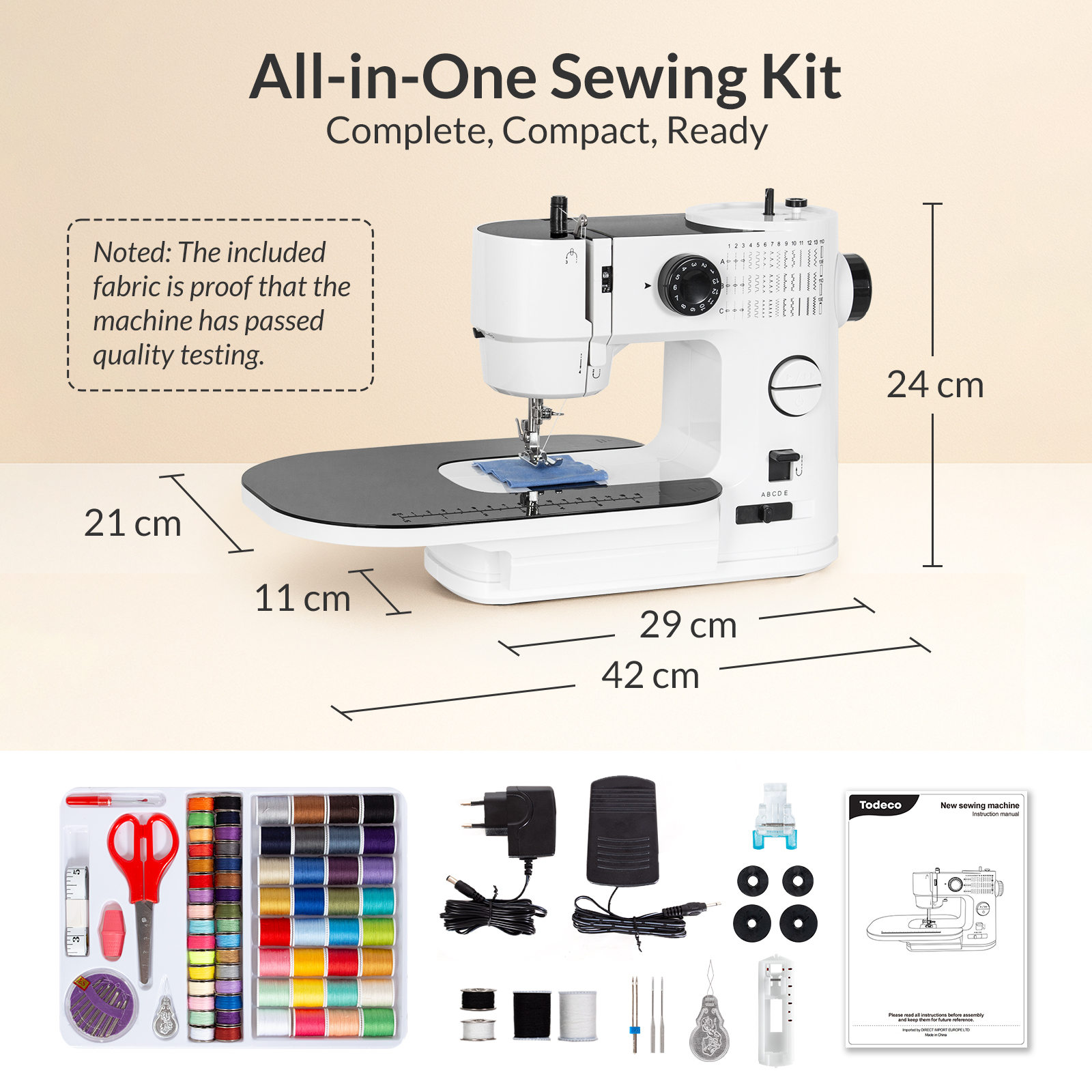 Kit de couture complet inclus : Livré avec un kit complet comprenant des fils colorés, des aiguilles, des canettes, des ciseaux, un mètre ruban et une pédale d’entraînement. Prêt à l’emploi, idéal pour débutants et couturiers confirmés. Remarque : Le tissu inclus sert de preuve que le produit a passé le contrôle de qualité.