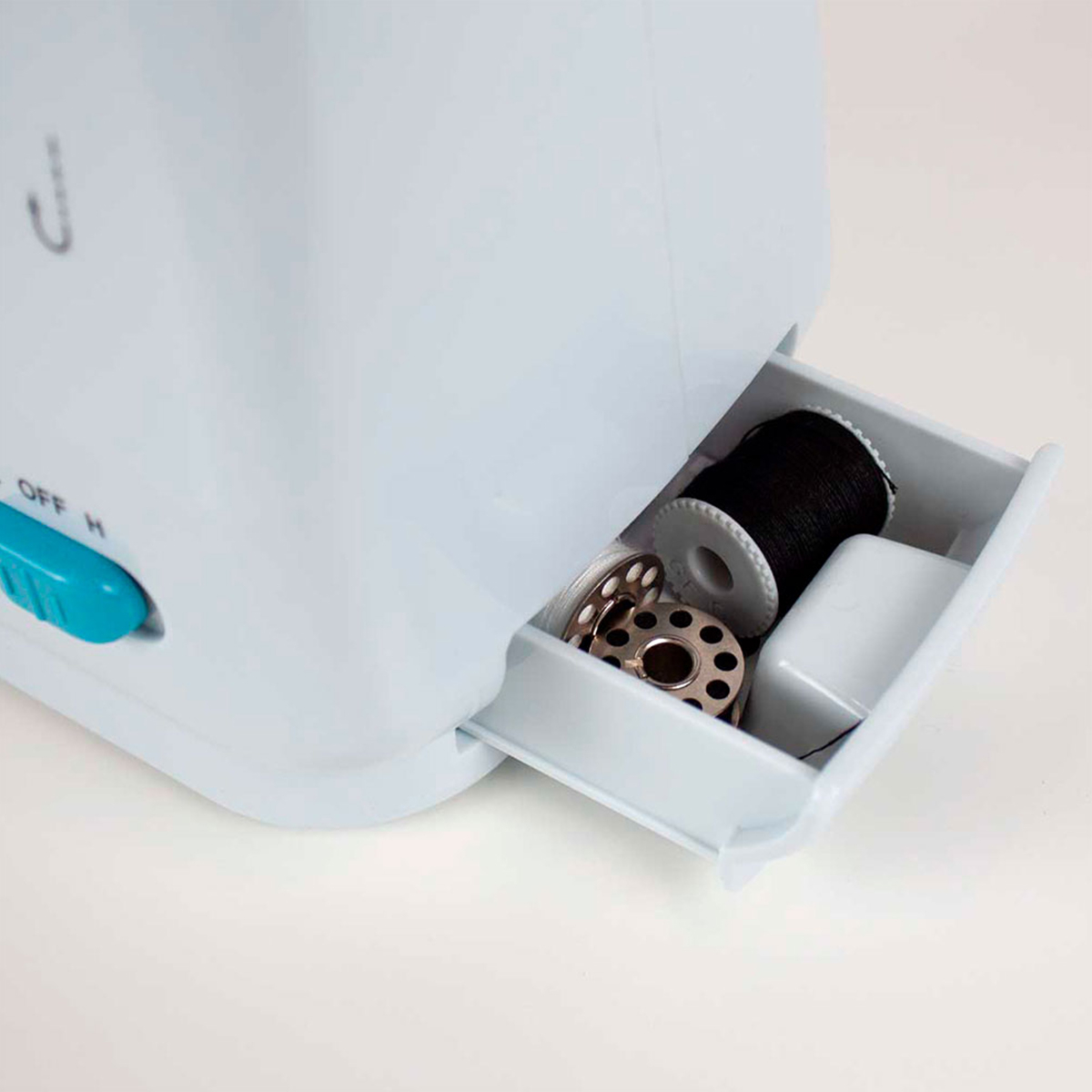 • Tiroir dissimulé. Elle possède un tiroir dissimulé pour ranger les fils, les aiguilles... et tout le matériel nécessaire à la fabrication des tissus.