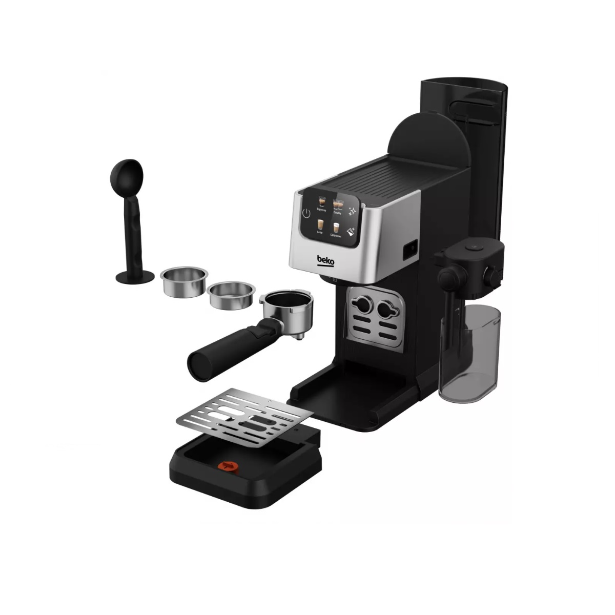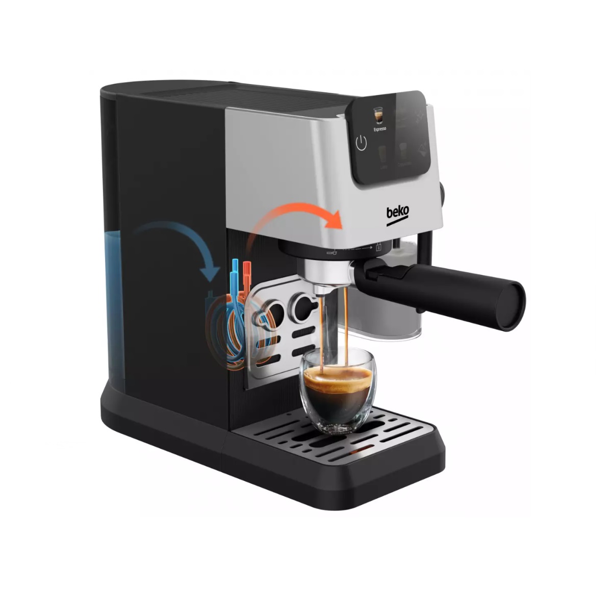 CEP5304X - machine à expresso 15bars silver - La machine expresso manuelle CEP5304X de Beko, possède un écran tactile coloré très design qui permet de sélectionner sa boisson très simplement. La carafe à lait permet de réaliser des cappuccinos et caffés latte avec une mousse de lait très onctueuse pour de délicieux cafés lactés. Aussi, vous disposez de 4 cafés au choix selon vos envies : un expresso, un double expresso, un cappuccino ou un latte en une seule touche. Pratique, vous pouvez contrôler le niveau d'eau du réservoir transparent amovible d'un seul coup d'œil et vous pouvez le retirer pour le remplir facilement. De plus, grâce au plateau chauffe tasse, préchauffez vos tasses pour avoir un café toujours chaud. Lors de la préparation de plusieurs tasses, posez les tasses prêtes sur le plateau pour qu'elles ne se réfroidissent pas.