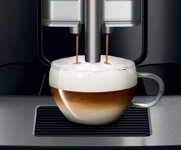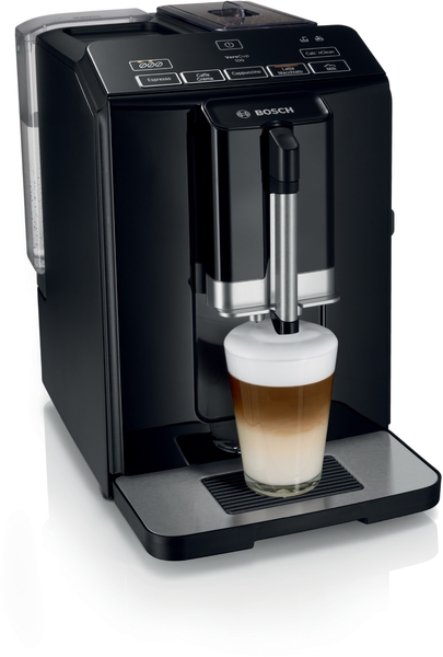 BOSCH - VeroCup 100 - 1300 watts, 15 bars, 5 boissons, bac à grains 250g, fonction OneTouch - technologie SensoFlow, entretien Calc'nClean, rincage de la buse lait auto, broyeur céramique - bandeau sensitif pictogrammes - réservoir eau : 1,4 L, Noir