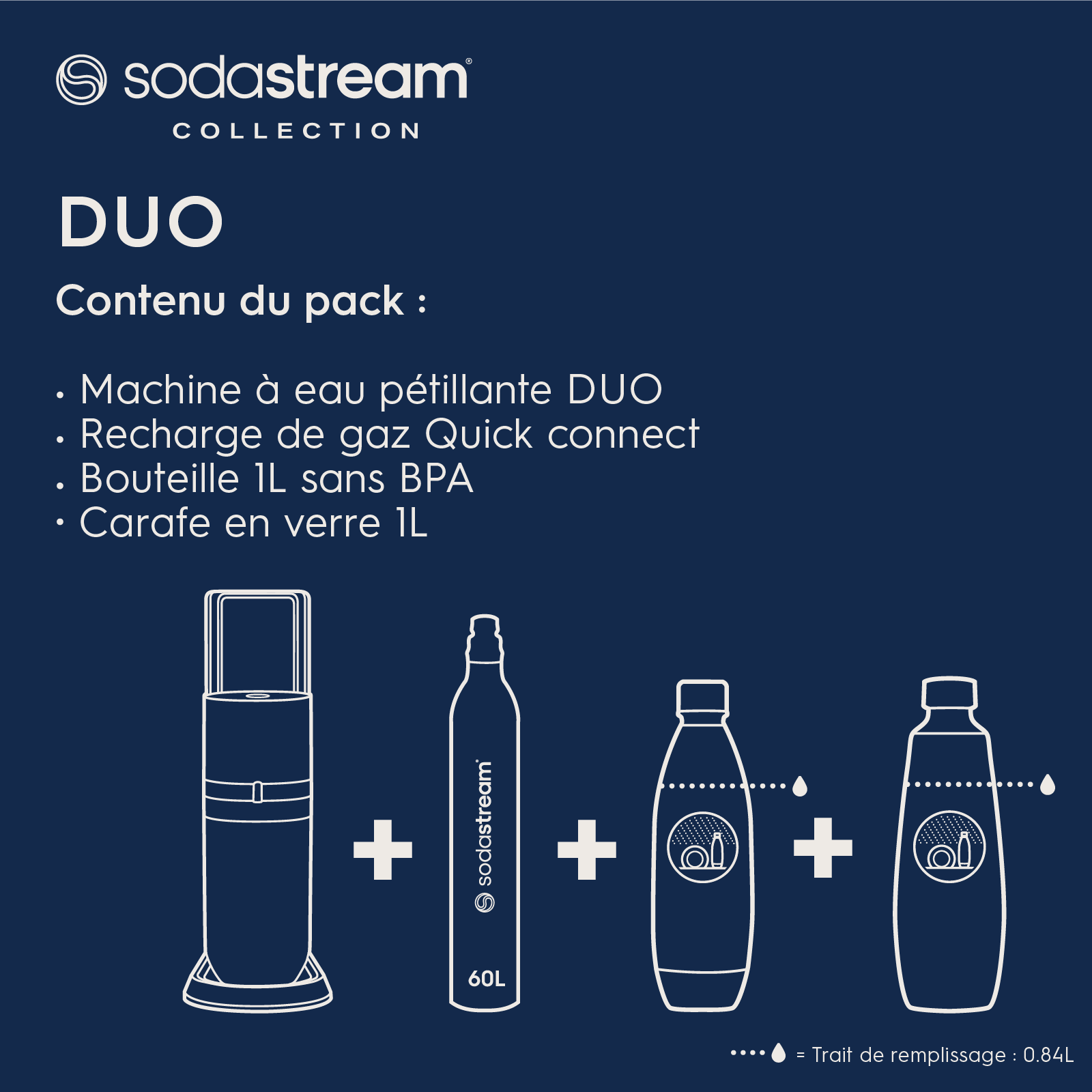 Libellé Machine à gazéifier Sodastream Duo Blanche Pack 1 carafe en verre 1L + 1 Bouteille 1L