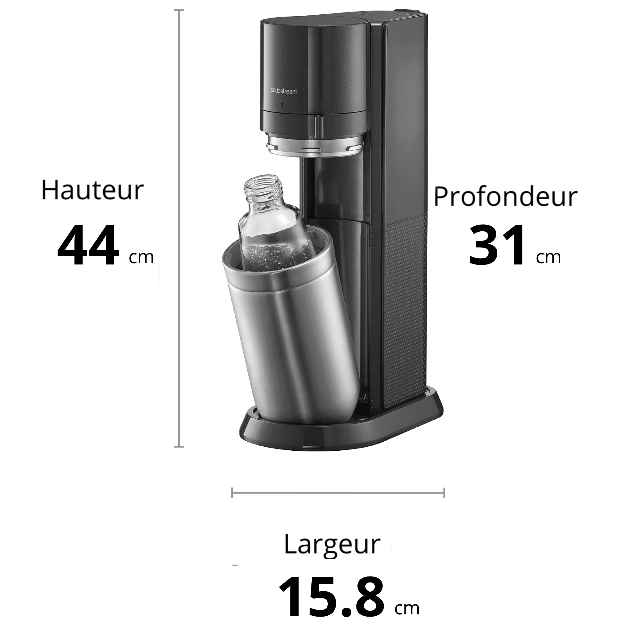 • 1 machine DUO prête à l’emploi permettant de réaliser vos boissons préférées sans les bouteilles en plastique à usage unique.