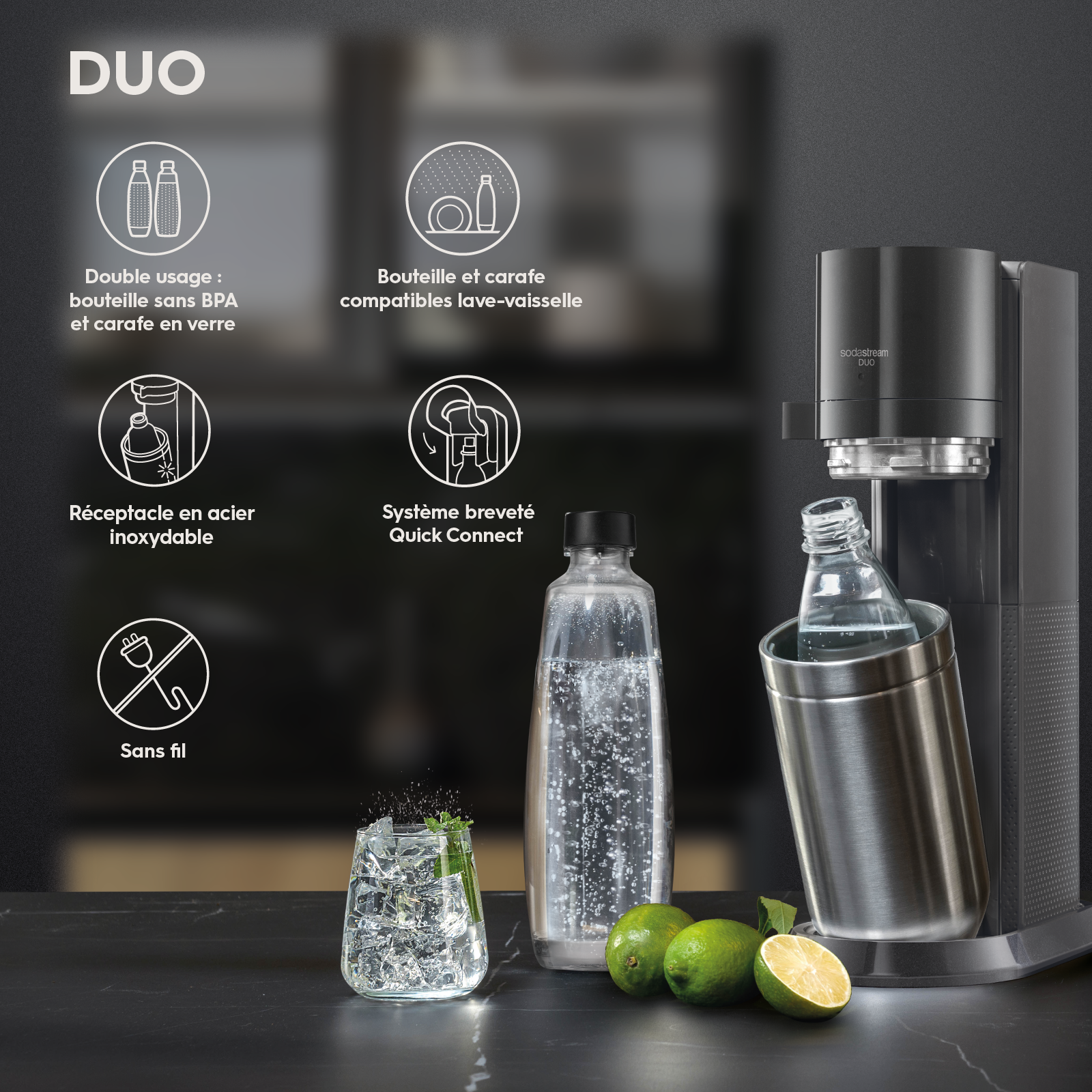 - DOUBLE USAGE - Compatible avec nos carafes en verre et bouteilles sans BPA, DUO vous permet de gazéifier selon vos envies, que ce soit à la maison ou en déplacement