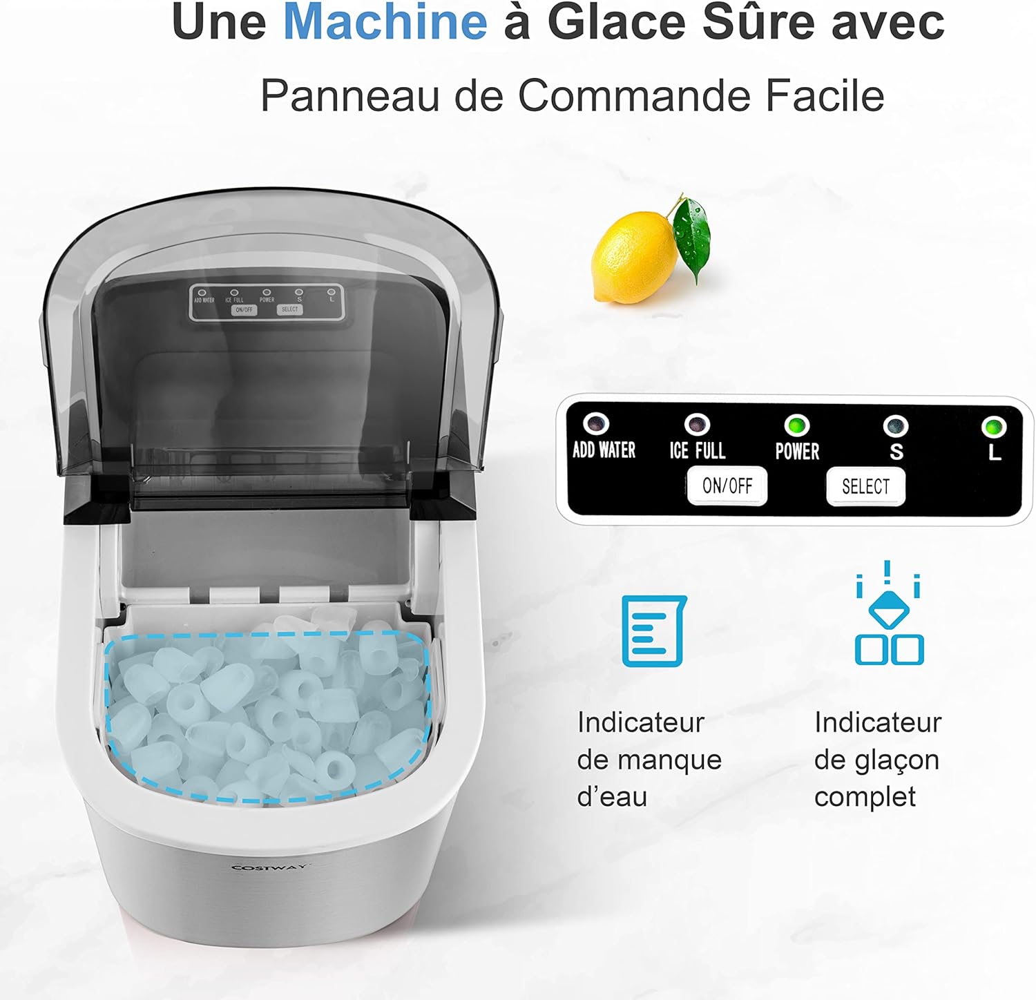 - Design impeccable: Cette machine à glaçon dispose d’une fenêtre de vue transparente, par conséquent vous pouvez garder un œil sur l’état des glaçons pendant le fonctionnement de la machine, et la couleur et l’apparence moderne convient parfaitement à tous les styles de maison.