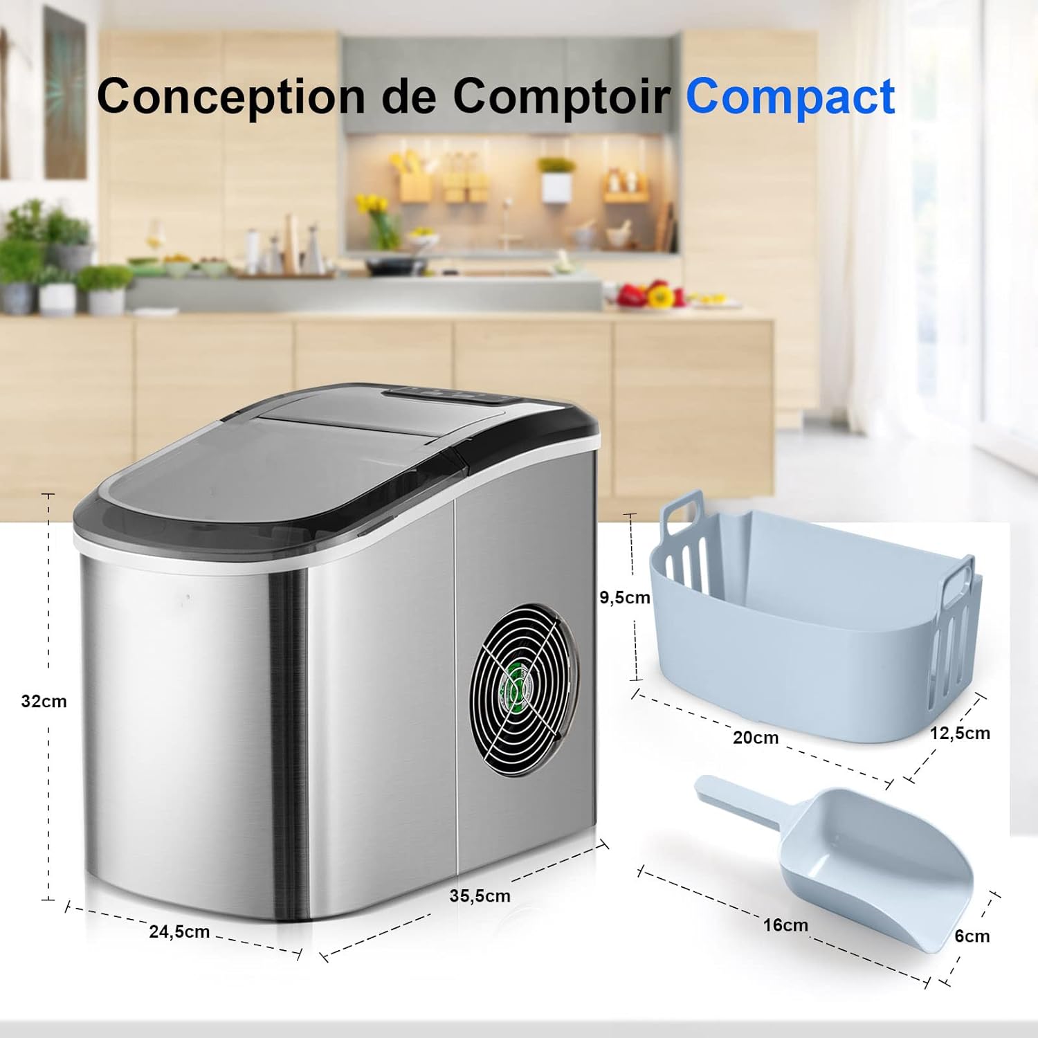 - Utilisation pratique: La machine à glaçon a une parfaite taille de 35,5 x 24,5 x 32 cm ( L x l x H ) qui occupe peu de place, et le réservoir de glace a une capacité de 2,1 litres, chaque temps de fabrication de glaçons est de 6 à 13 minutes, du coup elle est idéale pour la maison, le bureau, le barbecue et les fêtes de la famille.