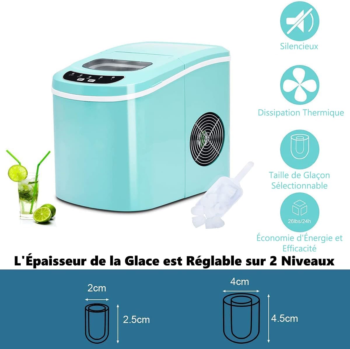 - Utilisation pratique: La machine à glaçon a une parfaite taille de 24 x 36 x 33 cm (L x l x H) qui occupe peu de place, et le réservoir de glace a une capacité de 2,2 litres, du coup elle est idéale pour la maison, le bureau, le barbecue et les fêtes de la famille.