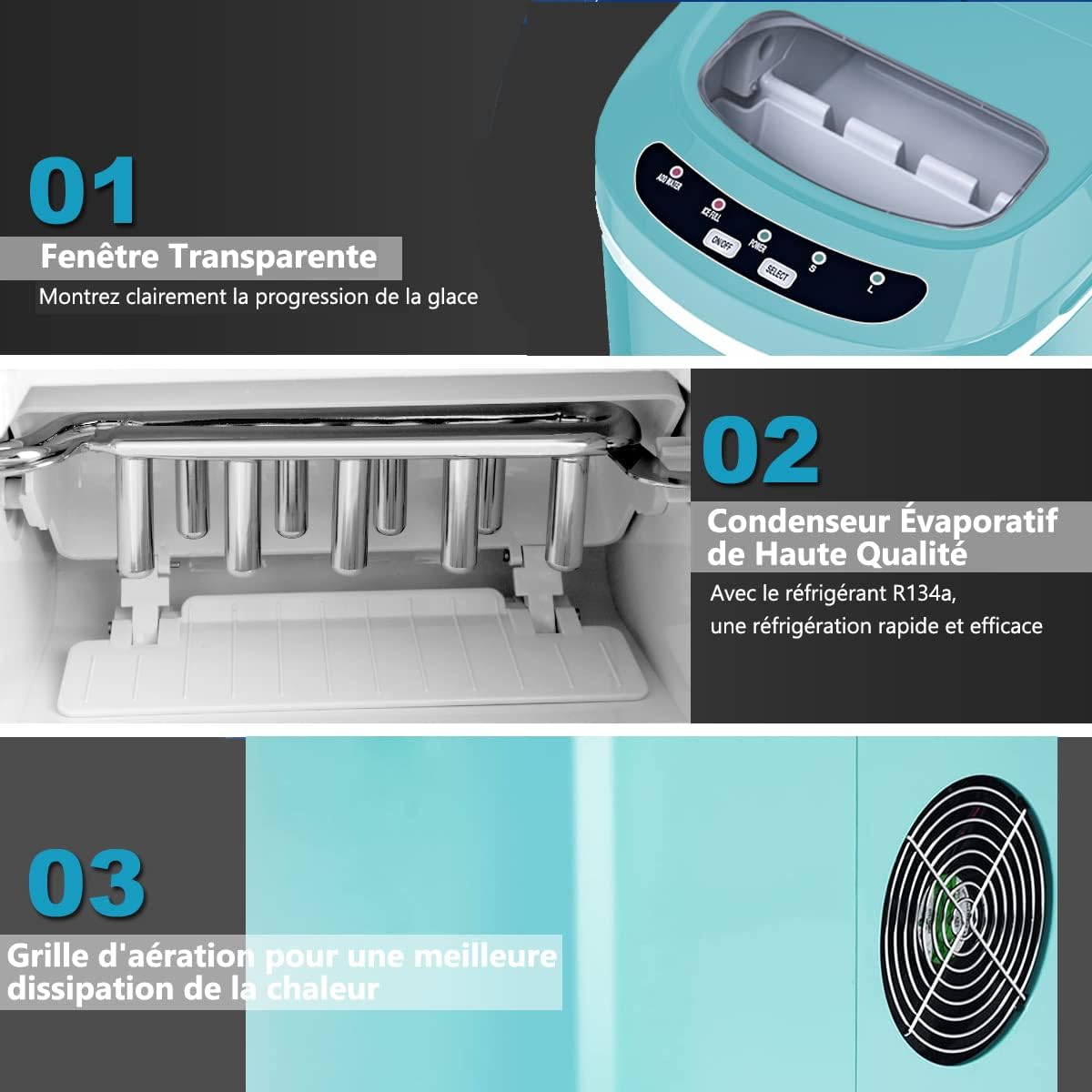 - Design impeccable: Cette machine à glaçon dispose d’une fenêtre de vue transparente, par conséquent vous pouvez garder un œil sur l’état des glaçons pendant le fonctionnement de la machine, et la couleur et l’apparence moderne convient parfaitement à tous les styles de maison.