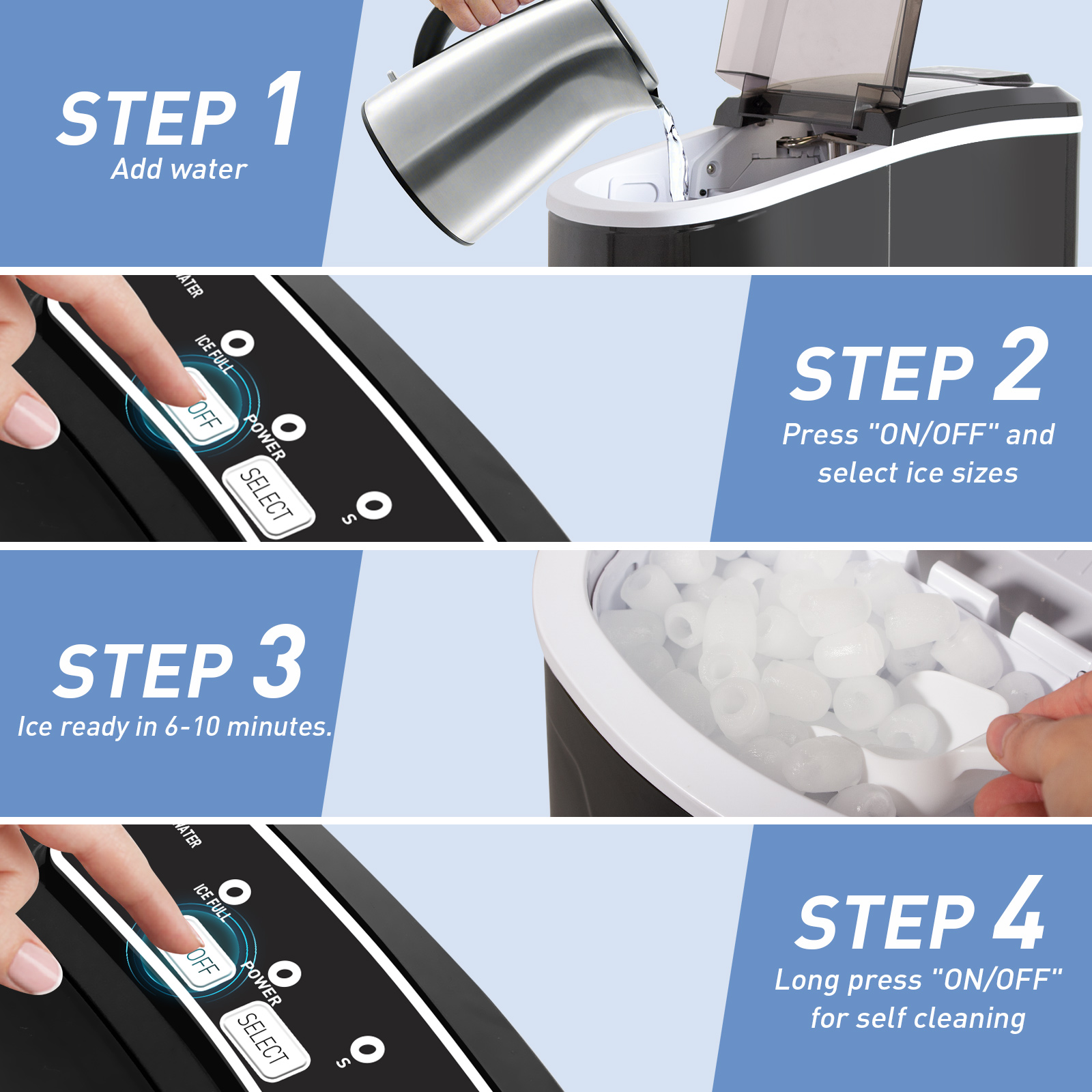 | Libellé | Machine à Glaçons pour la Maison, Capacité de 2,2L, 2 tailles de glaçons, 12kg en 24h, 9 Glaçons en 6-10 Minutes, Autonettoyant Machine à Glaçons |