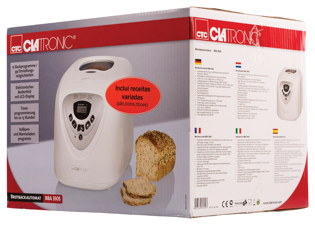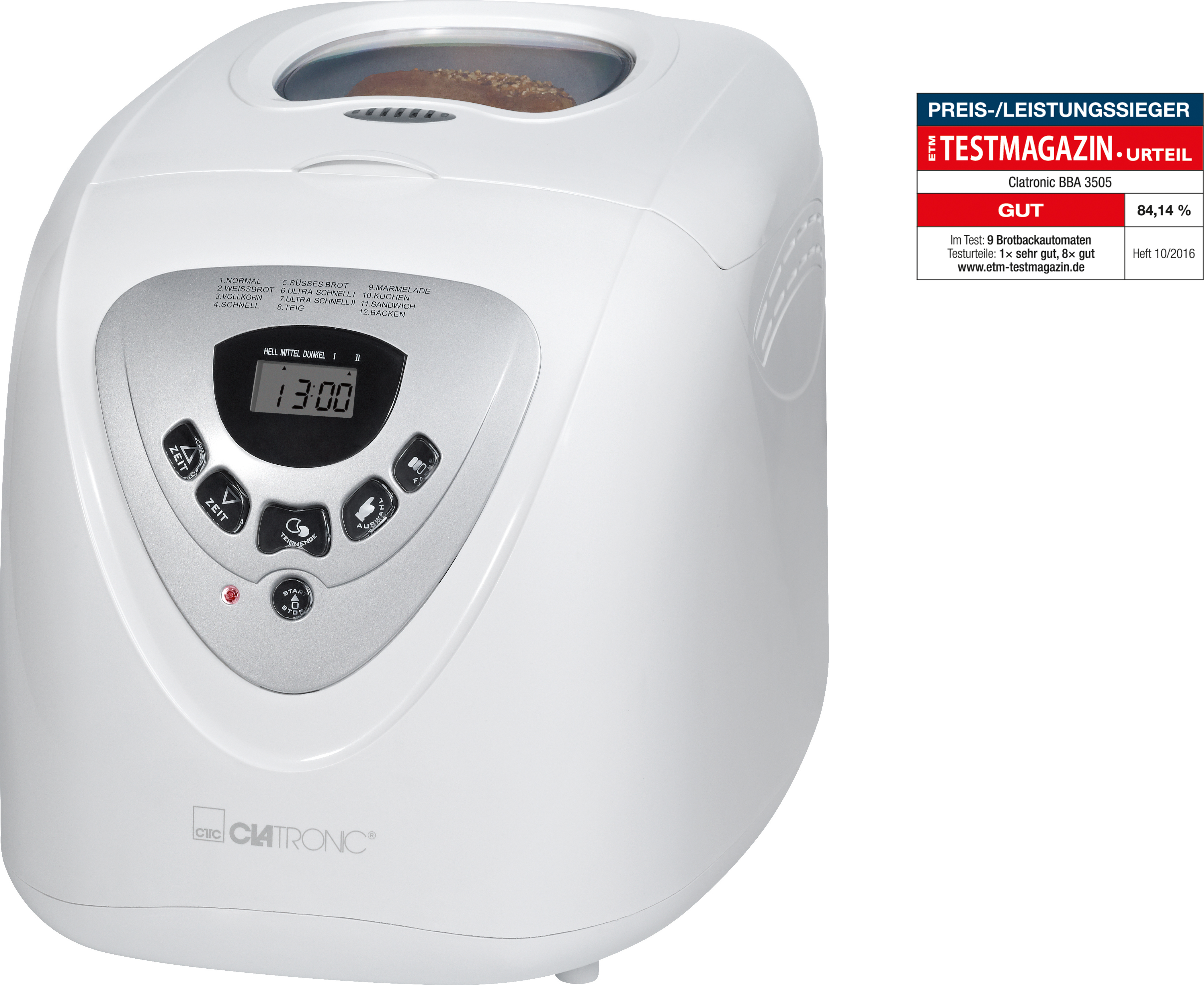 Machine à Pain 12 Programmes 1Kg, Sans Gluten, Pétrir, Fermenter, Cuire 600 Blanc ClatronicBBA 3505