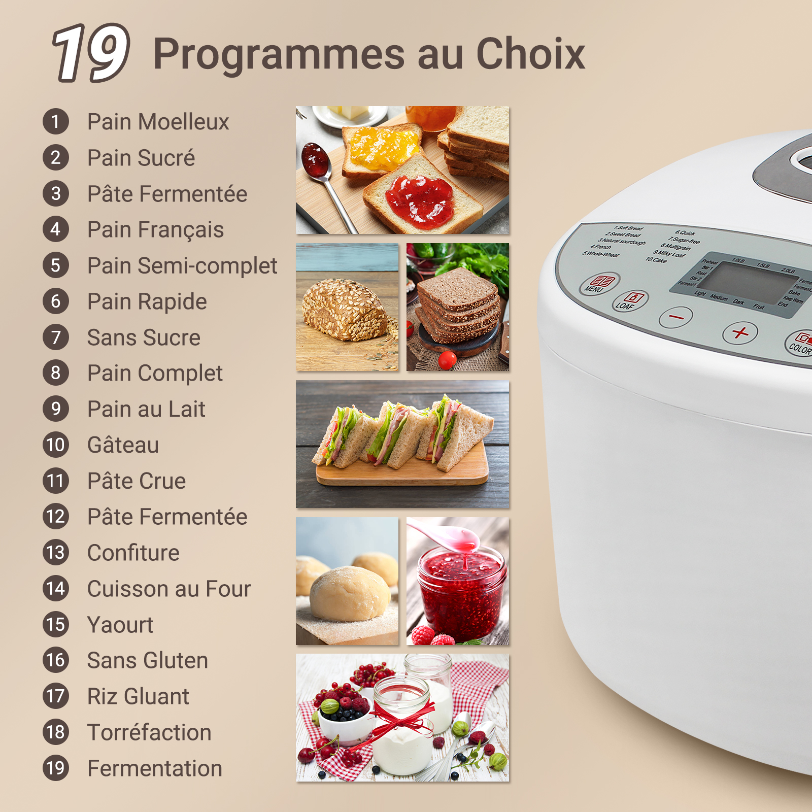 19 réglages programmables: pain doux, pain sucré, pain au levain naturel, pain fran?ais, pain de blé entier, pain rapide, pain sans sucre, pain multigrains, pain au lait, gateaux, pate crue, pate Levain, confiture, cuisson, yaourt, pain sans gluten, riz gluant, sautés et Ferment