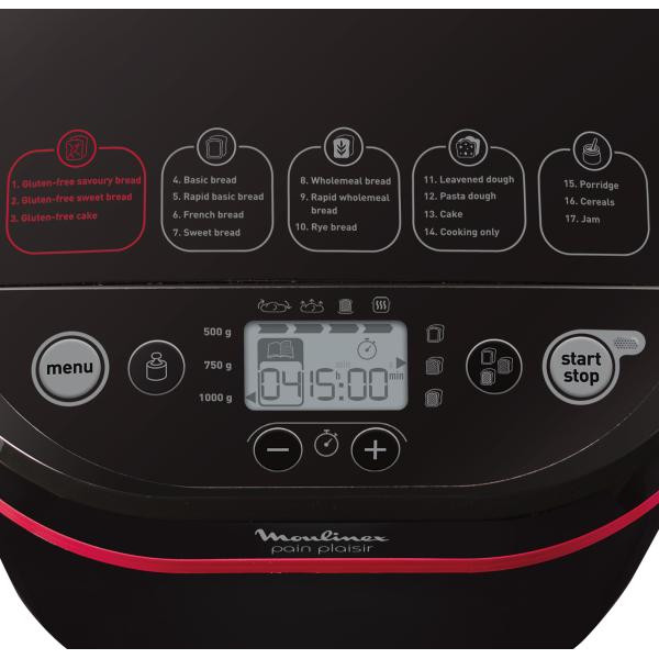 | Libellé | Machine a Pain MOULINEX , 1 kg, 17 programmes, 3 niveaux de dorage, Programmable, Maintien au chaud Pain & Plaisir OW220830 |