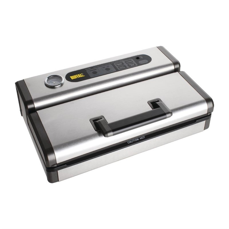 Si vous avez besoin de faire vos préparations avant le service, ou si vous souhaitez simplement prolonger la durée de vie des aliments frais, la machine sous vide inox Buffalo est l'appareil idéal. Conçue pour la performance, la fiabilité et la facilité d'utilisation, cette machine élimine rapidement l'air des sacs sous vide gaufrés et les scelle afin de pouvoir réfrigérer, congeler, réchauffer au micro-ondes ou au bain-marie le contenu. La machine peut également être utilisée comme soudeuse indépendante. Ne convient pas aux liquides. Remarque: à utiliser uniquement avec des sacs sous vide gaufrés, tels que les sacs et rouleaux sous vide gaufrés Vogue. | Marque: BuffaloMatériel: Acier inoxydable, ABSRendement: 130Poids: 3,5 kgLargeur de soudure max 30cmPression sous vide Max.-0.90barPuissance d'aspiration : 15L / mnFonctions mise sous vide et soudureFonction soudure manuelleOptions de temps de soudure normale / prolongéeOptions de pression sous vide normale / douceMise sous vide accéléréeManomètre intégréRangement du cordon d'alimentation130W.