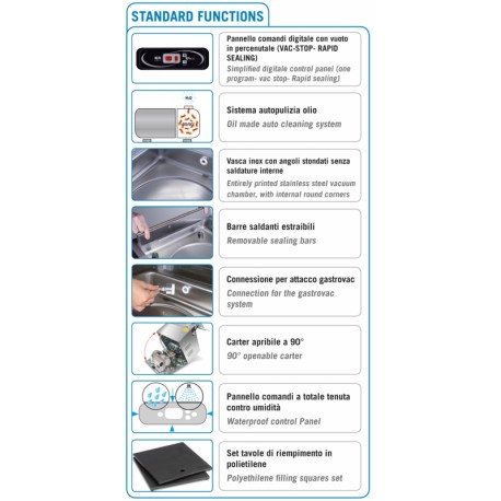 Sous videuse professionnelle à poser, gamme Prestige des chez Lavezzini. | La ligne de machines sous vide de table s'adresse au client exigent pour qualité, structure et performance de l'appareil. La nouvelle version, mise à jour et étoffée de nouvelles fonctionnes, dispose de tout ce qui est mieux pour la clientèle, à partir du réglage du vide en pourcentage qui garanti un conditionnement , le système auto nettoyant de la pompe, qui empêche la pollution de l'huile et, enfin, la complète ouverture du meuble pour faciliter l'entretien et l'après vente. Tout dans le respect de trois points fondamentales: l'excellente qualité opérationnelle la fiabilité dans le tempsla totale flexibilité des appareils, vers n'importe quel secteur soient utilisés Il est aussi possible d'équiper les machines avec atmosphère modifiée, et panneaux commandes analogique, pour ceux qui préfèrent la tradition. Caractéristiques techniques : Dimensions (L x P x H) mm : 410 x 480 x 420Dimensions de la chambre (L x P x H) mm : 310 x 350 x 190 Matière : InoxBarre de soudure : 300 mmPompe du vide : Quantité = 10 m3/h-HUILEPoids : 35 kgPuissance : 1 kWTension (V) : 230Fréquence : 50-60 HzCette machine nécessite des sacs sous vides lisses