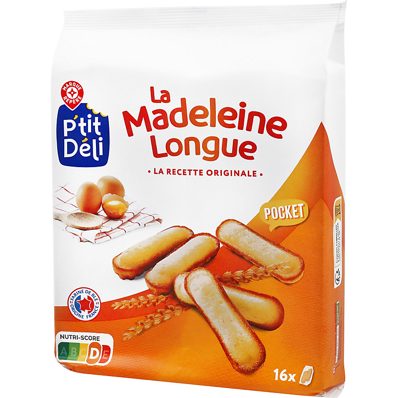 Ingrédients : Farine de blé 30 % ; huile de colza ; sucre ; œufs 17 % ; stabilisant : glycérol ; lait demi-écrémé ; sirop de glucose ; émulsifiant : E471 ; amidon de maïs ; poudres à lever : E500, E331 (dont blé) ; sel ; arôme.