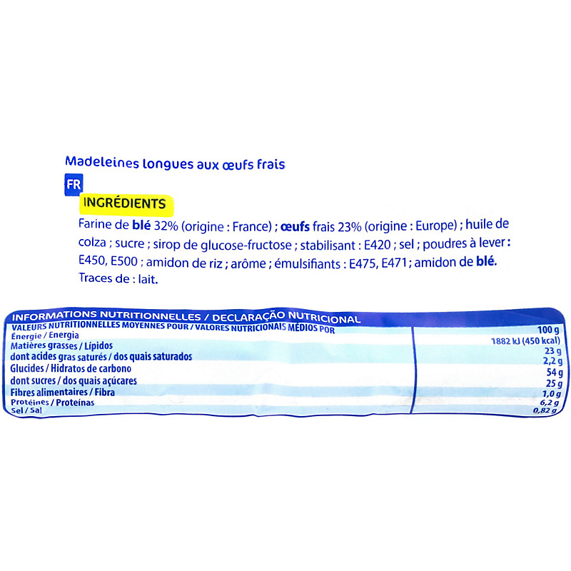 Ingrédients : farine de blé 32 % ; sucre ; huile de colza ; oeuf 17 % ; sirop de glucose ; stabilisant : sorbitols ; poudres à lever : E450, E500 ; sel ; poudre de lait écrémé ; arôme.