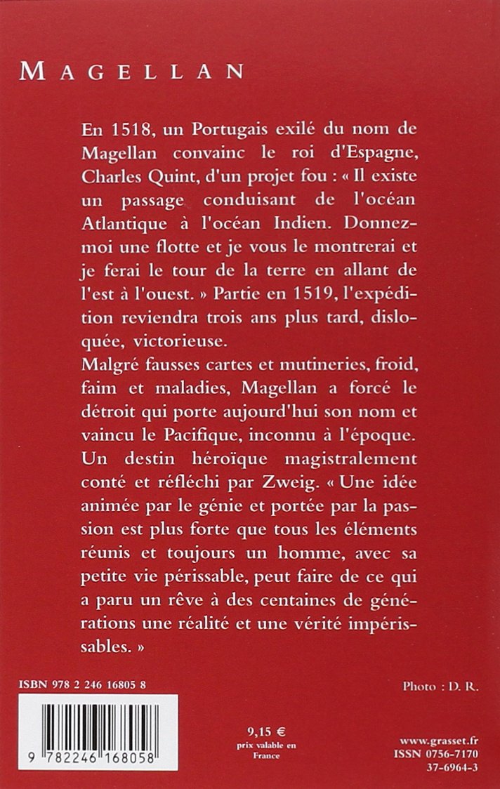 Publié en 1938, ce livre traduit la fascination de Zweig, explorateur de l'âme humaine et voyageur impénitent, pour l'exploit réalisé par le conquistador de Charles Quint. Magellan et ses hommes réussirent au début du XVIe siècle le premier tour du monde.