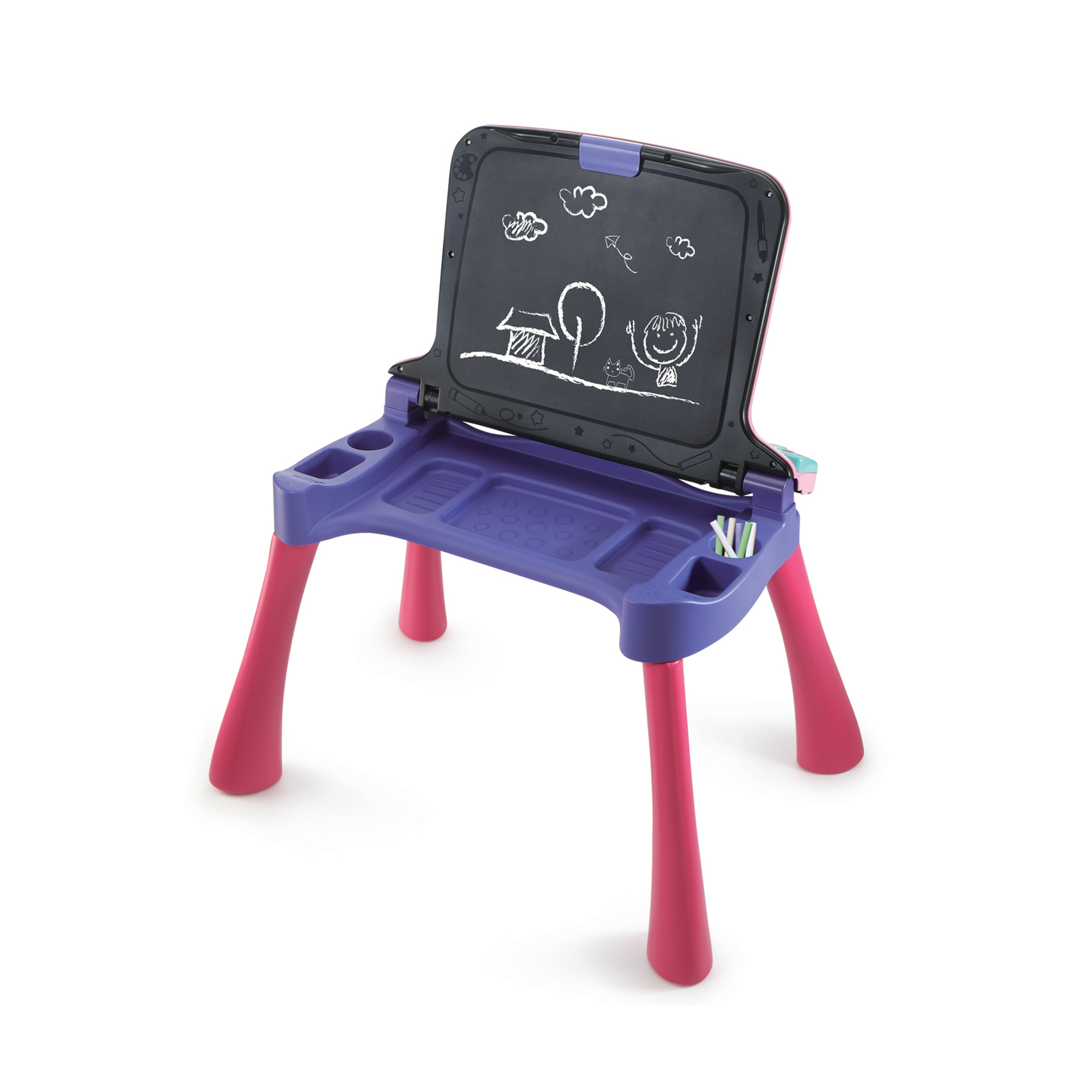 Magi bureau interactif 5 en 1 rose - 3 - 6 ans Magique ! 4 disques inclus pour projeter 28 images pour enrichir le jeu mais aussi apprendre à dessiner ! Et toujours : Fonction bureau : avec un écran interactif pour apprendre à tracer les lettres et les chiffres, un lecteur de musique, une horloge, un calendrier, un cadre photo pour personnaliser son bureau, 5 fiches interactives et tactiles pour faire le plein de découvertes sur différents thèmes : l'alphabet, les nombres, les parties du corps, les vêtements, les instruments de musique etc. Fonction écriture : grâce à l'écran, l'enfant apprend à tracer les lettres et les chiffres en suivant le tracé des LED qui s’allument. Le stylet inclus est reconnu par l’écran afin de guider au mieux l’enfant dans son apprentissage. Chevalet : pour accrocher des feuilles de dessin et laisser libre-cours à ses talents d’artiste. Tableau noir : pour dessiner à la craie ou jouer au maître ou à la maîtresse. Les voix et les animations à l’écran se déclenchent lorsque l’enfant touche les fiches interactives. 5 grandes fiches interactives incluses Porte crayon/porte-craies et tabouret inclus Réglage du volume sonore Boîte fermée Fonctionne avec 4 piles LR6 non fournies