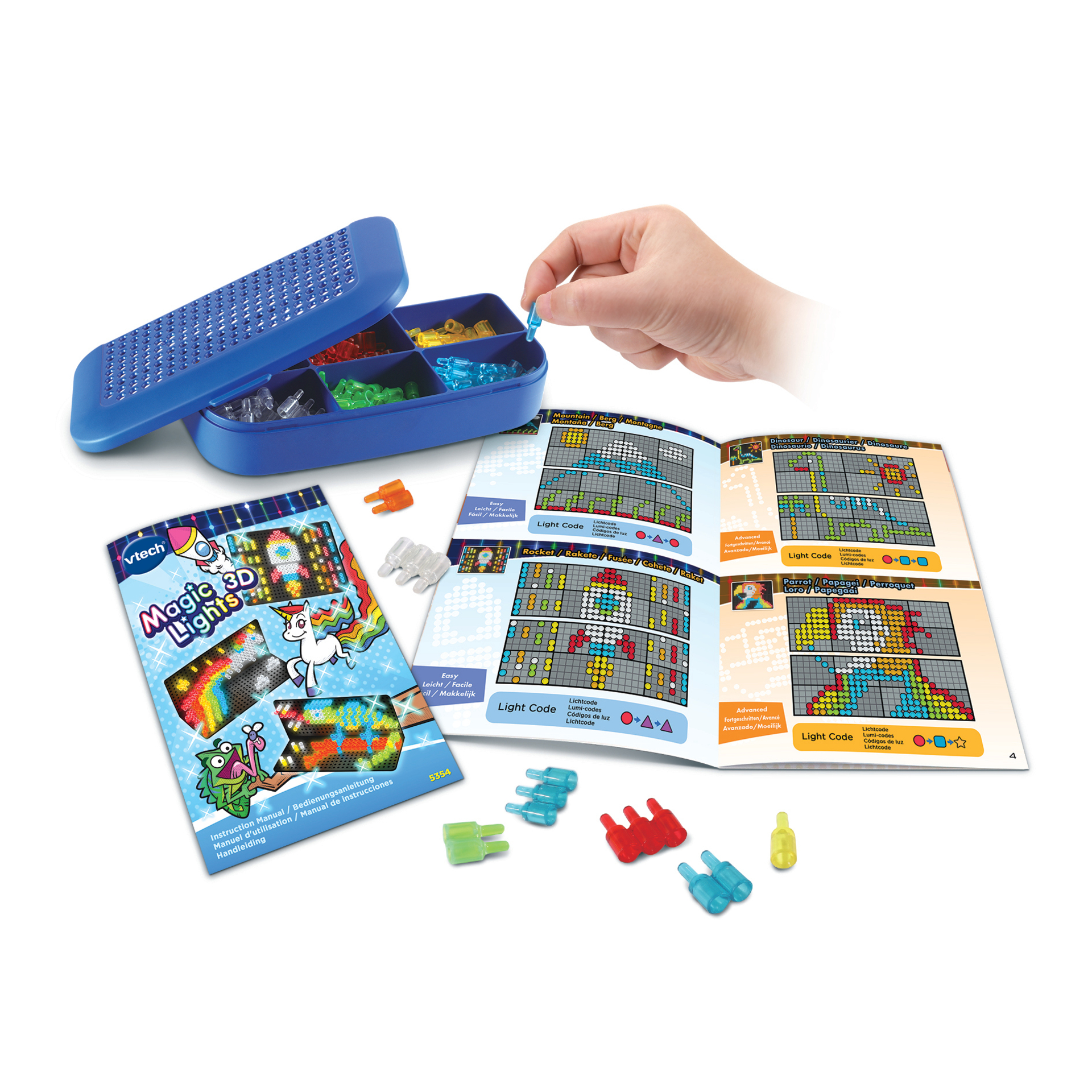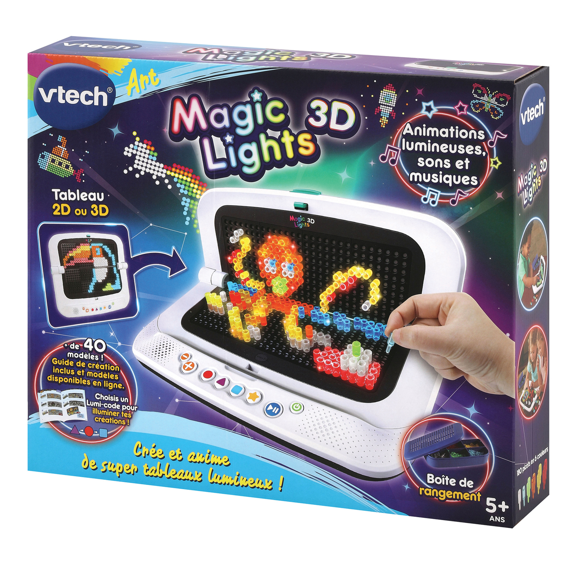 Magic Lights 3D - 5 ans et + Un nouveau concept artistique pour créer de fabuleux dessins lumineux en 3D ! • Grâce à Magic Lights 3D, laisse libre cours à ton imagination pour créer des dessins lumineux en 2D ou en 3D ! • Le support tableau Magic Lights 3D permet grâce à ses 8 boutons de commande et ses 16 LEDs incluses de créer des tableaux colorés et lumineux à l’infini. • Les effets lumineux (34 au total) se programment en entrant une séquence de code sur la plateforme et donnent vie aux créations. • Deux modes de jeu : - Création en 2D : pour créer des dessins à plat - Création en 3D : pour créer des dessins en volume et leur donner plus de profondeur. • Le guide de création inclus permet à l’enfant de suivre des modèles prédéfinis, mais il peut également laisser parler son imaginaire pour créer ses propres tableaux lumineux. • Contient 16 modèles de créations (dessin + séquence lumineuse) et des modèles additionnels sont téléchargeables en ligne. • 180 picots translucides de 6 couleurs et 3 formes différentes inclus. • 1 boîte de rangement incluse pour ne pas égarer ses picots. Boîte fermée. Fonctionne avec 4 piles LR6 non incluses.