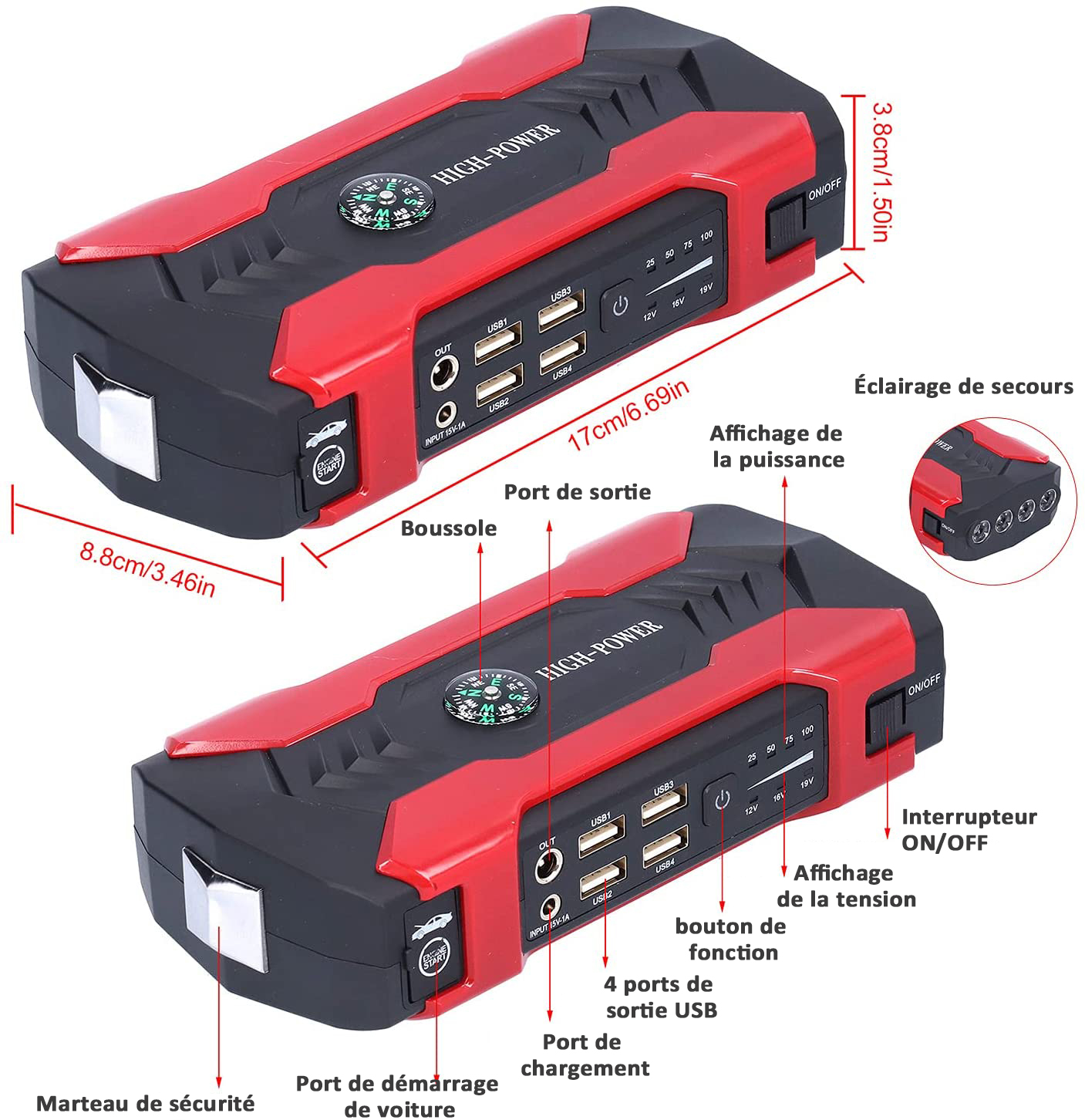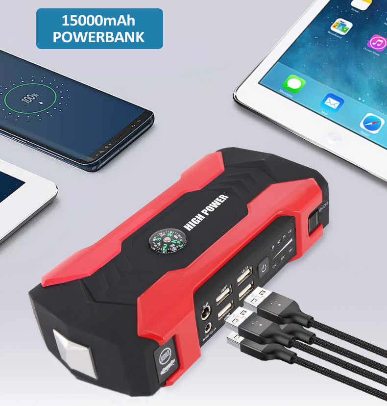 【Petit et Puissant】- Son courant de pointe de 600A peut démarrer les véhicules 12V (jusqu'à 6.0L moteur essence ou 3.0L diesel) jusqu'à 30 fois 【Chargeur portable de grande capacité】- Équipé de 4 sorties USB, le port USB 3.0 charge vos appareils plus rapidement et est compatible avec presque tous les appareils de charge USB 【LED Ultra lumineuses avec 4 modes】- Éclairage, flash, SOS et le mode d'avertissement