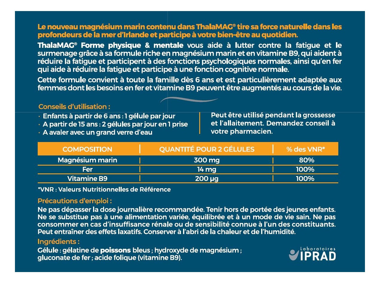 Thalamag Magnésium Marin Forme Physique et Mentale 60 Gélules est un complément alimentaire pour lutter contre la fatigue et le surmenage grâce à sa formule enrichie : - en Magnésium marin et en vitamine B9, qui aident à réduire la fatigue et participent à des fonctions psychologiques normales, - en Fer qui aide à réduire la fatigue et participe à une fonction cognitive normale. Cette formule convient à toute la famille et est particulièrement adaptée aux femmes dont les besoins en fer et en vitamine B9 peuvent être augmentés au cours de la vie.