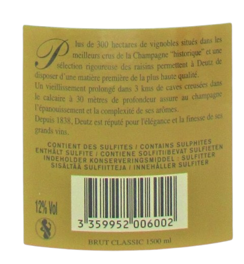| Dégustation bouche (bouche) | Brut Classic Deutz associe la fraîcheur du Chardonnay, l'onctuosité du Pinot et une élégante vinosité. Les arômes sont bien fondus et la texture soyeuse. |