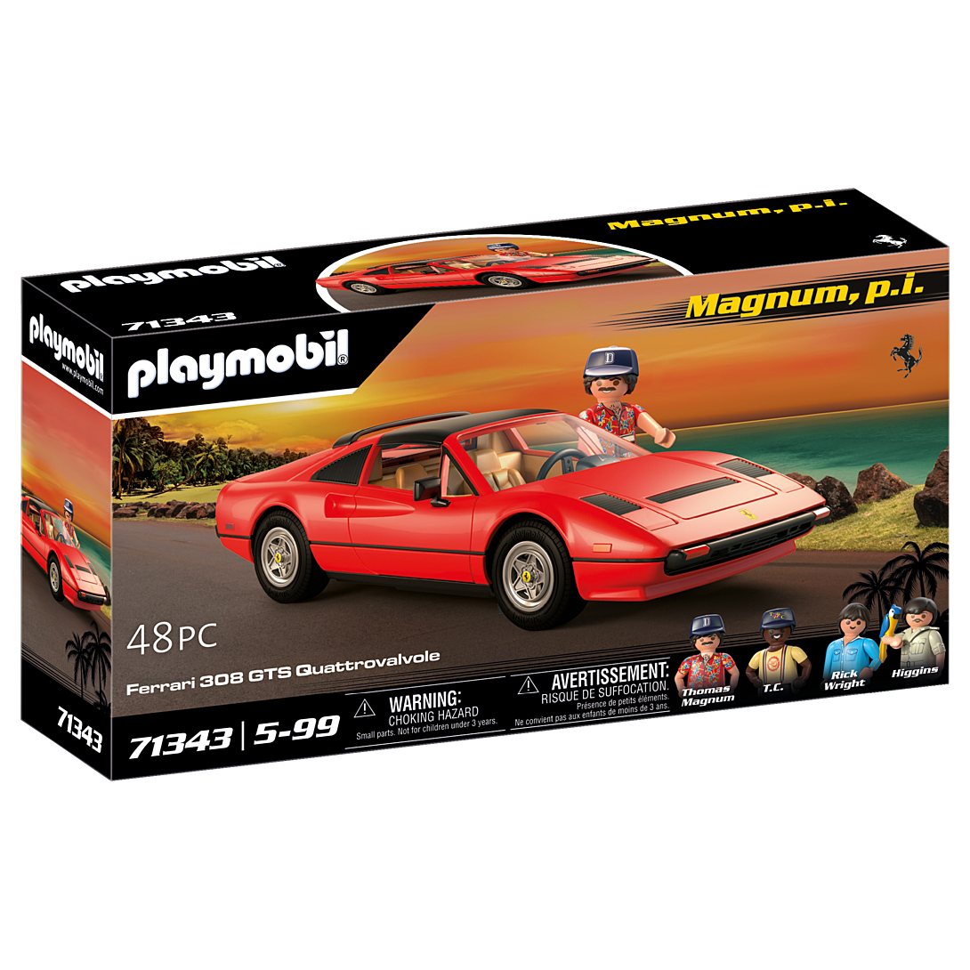 Avez-vous vu la nouvelle voiture du détective privé Thomas Sullivan Magnum? C'est une Ferrari 308 GTS Quattrovalvole, tout droit sortie de la série télévisée américaine "Magnum", datant des années 80. Avec cette voiture, amusez-vous à résoudre des enquêtes comme un vrai détective ! Le toit peut être retiré pour y mettre deux personnages. On peut ouvrir le capot à l'arrière et les phares avant s'ouvrent aussi ! En plus, les quatre personnages de la série et un perroquet sont prêts pour vous aider à résoudre les enquêtes ! Alors, prêt pour l'aventure ?