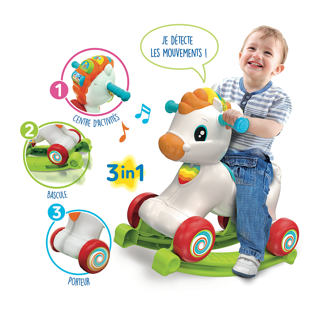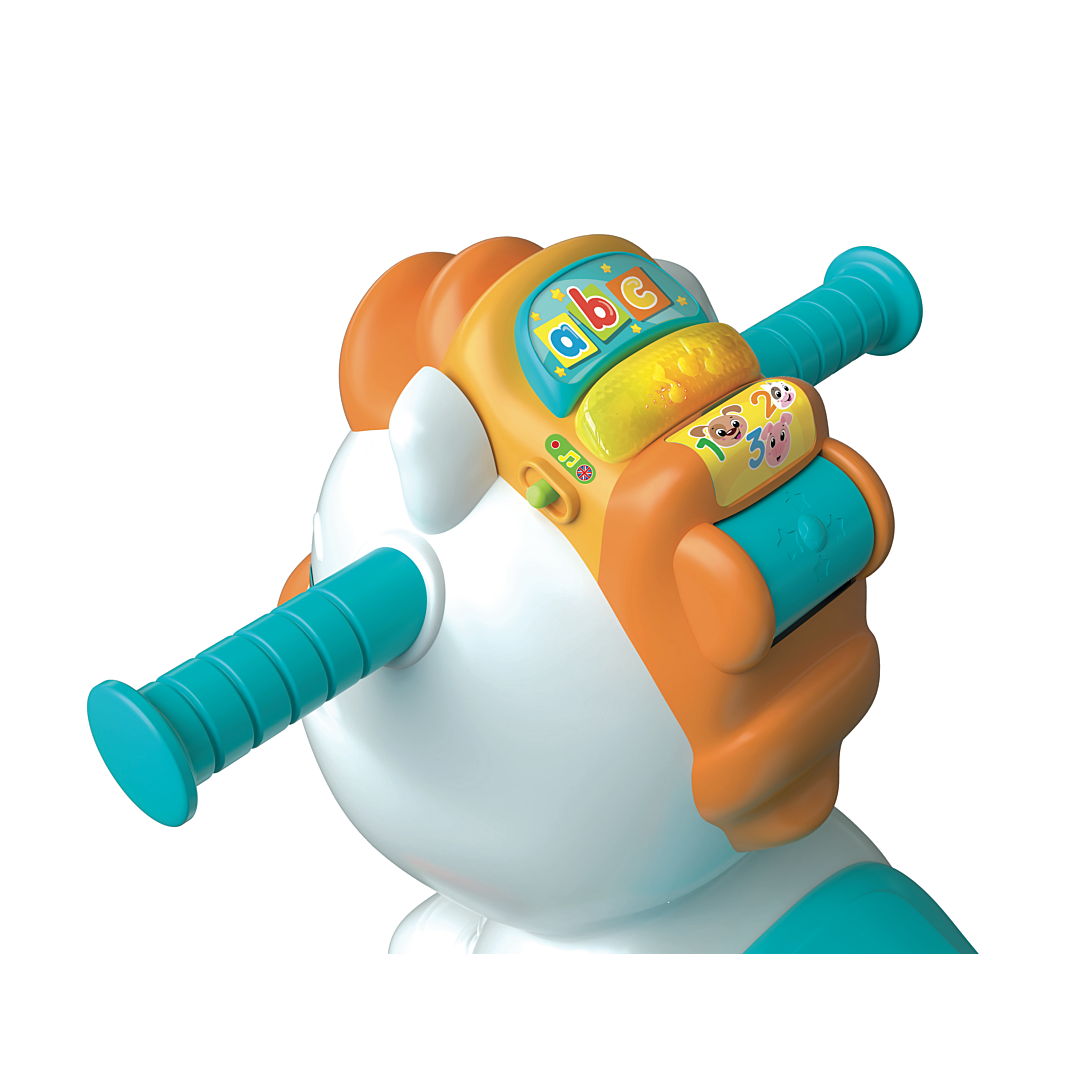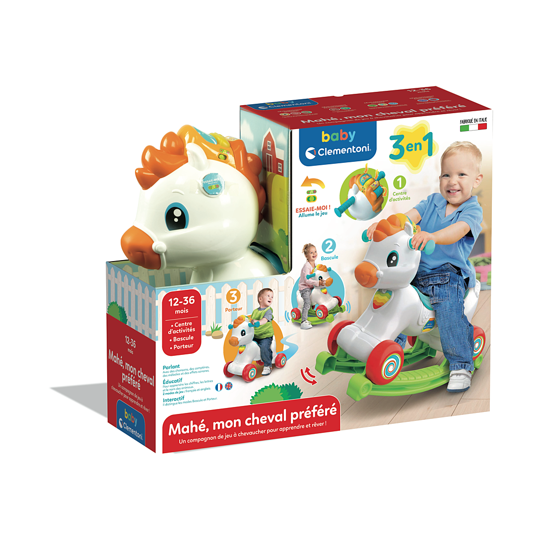 • Un adorable cheval à bascule à chevaucher qui est aussi un centre d’activités interactif ! • Grâce à un capteur, Mahé détecte le mouvement et divertit l’enfant avec des effets sonores réalistes, des phrases amusantes et des chansons. • Si l’enfant caresse la crinière, celle-ci s’illumine et le cheval interagit avec l'enfant en l’invitant à prendre soin de lui. • Les touches situées sur la crinière enseignent les lettres, le cri et le nom des animaux, et la roulette énonce les premiers chiffres. L'enfant pourra même apprendre quelques mots d’anglais !
