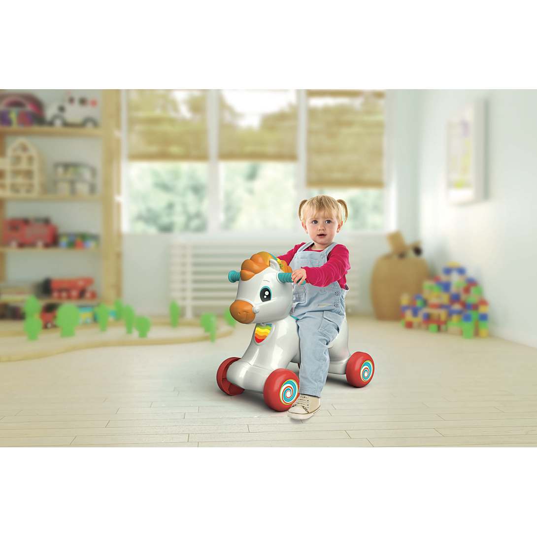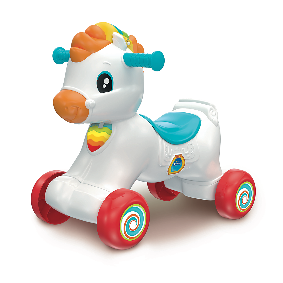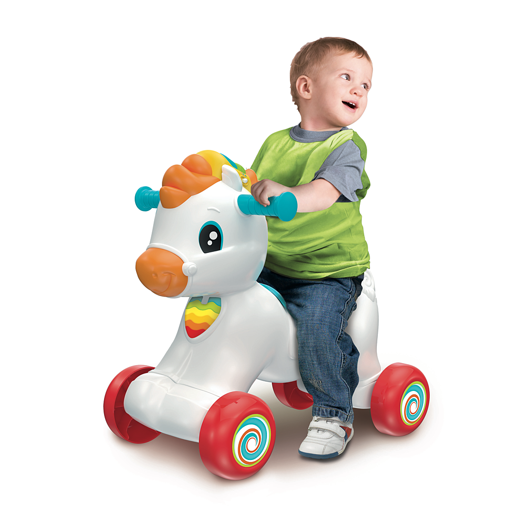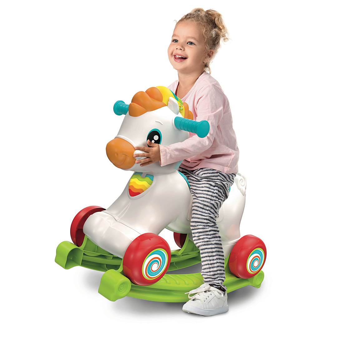 • Un adorable cheval à bascule à chevaucher qui est aussi un centre d’activités interactif ! • Grâce à un capteur, Mahé détecte le mouvement et divertit l’enfant avec des effets sonores réalistes, des phrases amusantes et des chansons. • Si l’enfant caresse la crinière, celle-ci s’illumine et le cheval interagit avec l'enfant en l’invitant à prendre soin de lui. • Les touches situées sur la crinière enseignent les lettres, le cri et le nom des animaux, et la roulette énonce les premiers chiffres. L'enfant pourra même apprendre quelques mots d’anglais !
