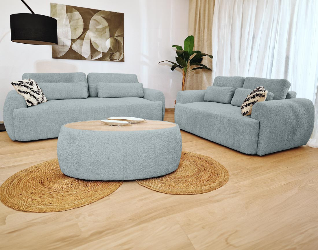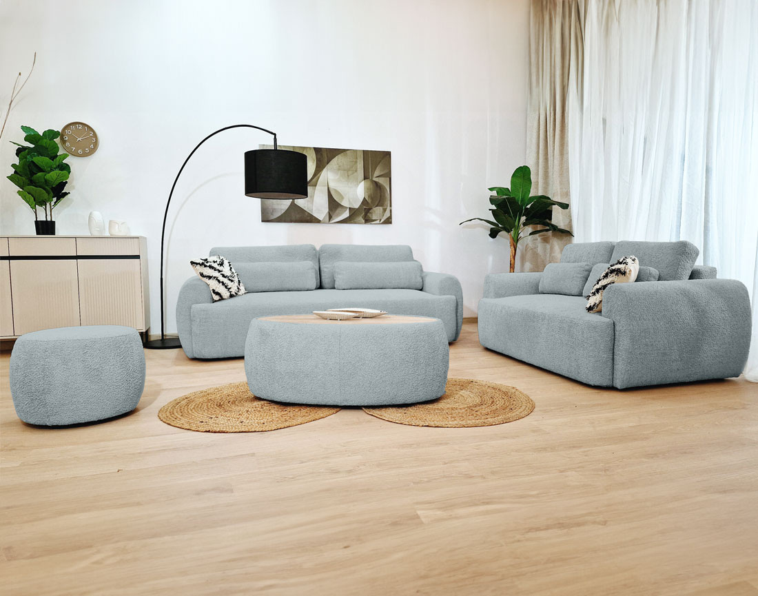 - Présentation de la collection : Puisant son charme dans sa forme organique, ses lignes arrondies et son revêtement en tissu bouclette, la collection Mahina ajoutera du charme à votre salon.